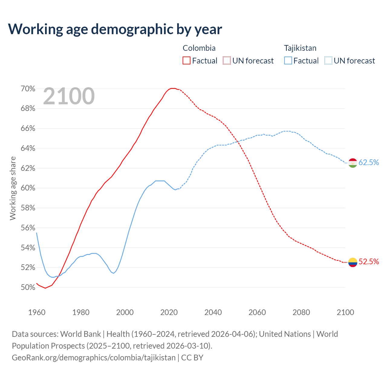- Colombia has 37.8M working age adults (aged 15-64) vs 6.61M in Tajikistan.