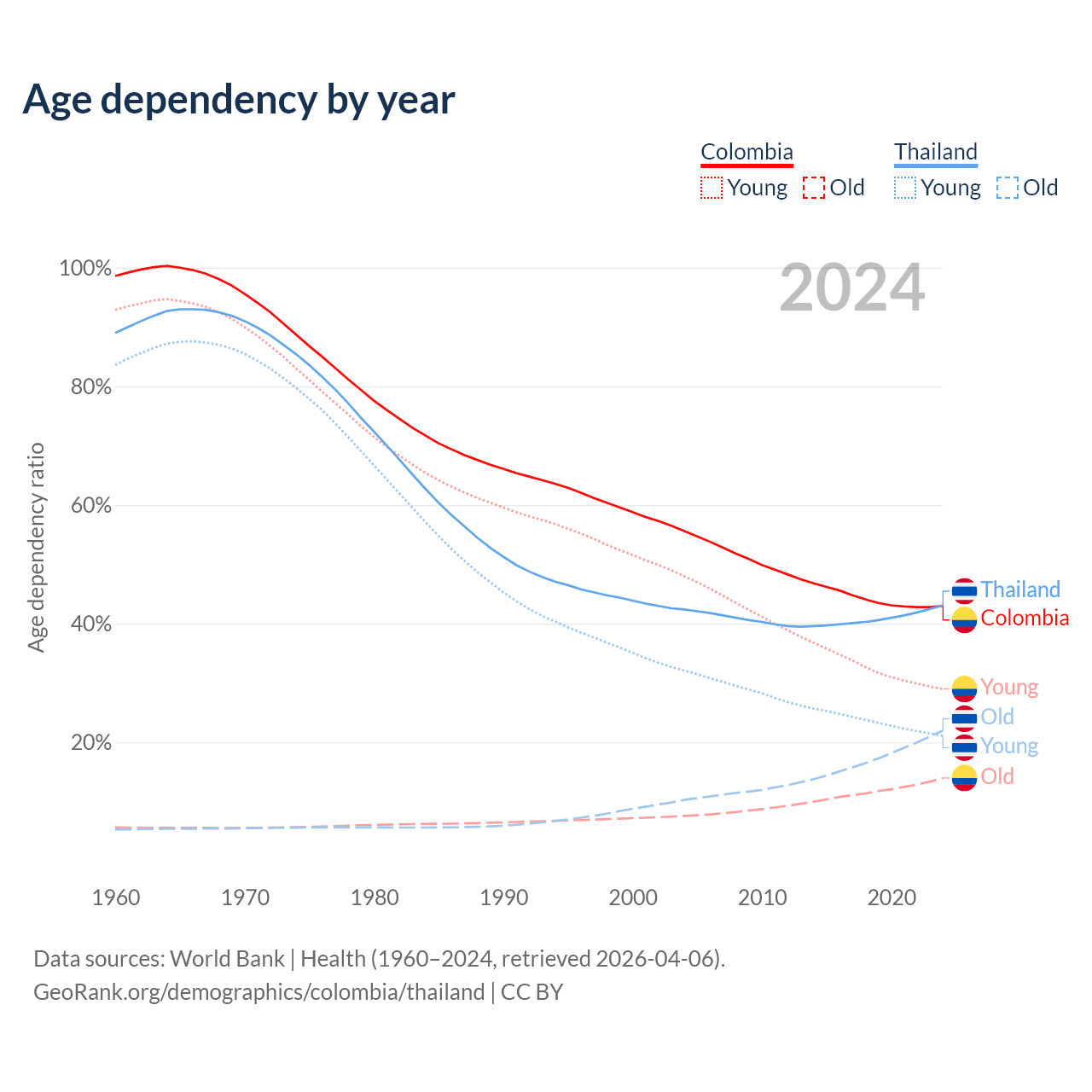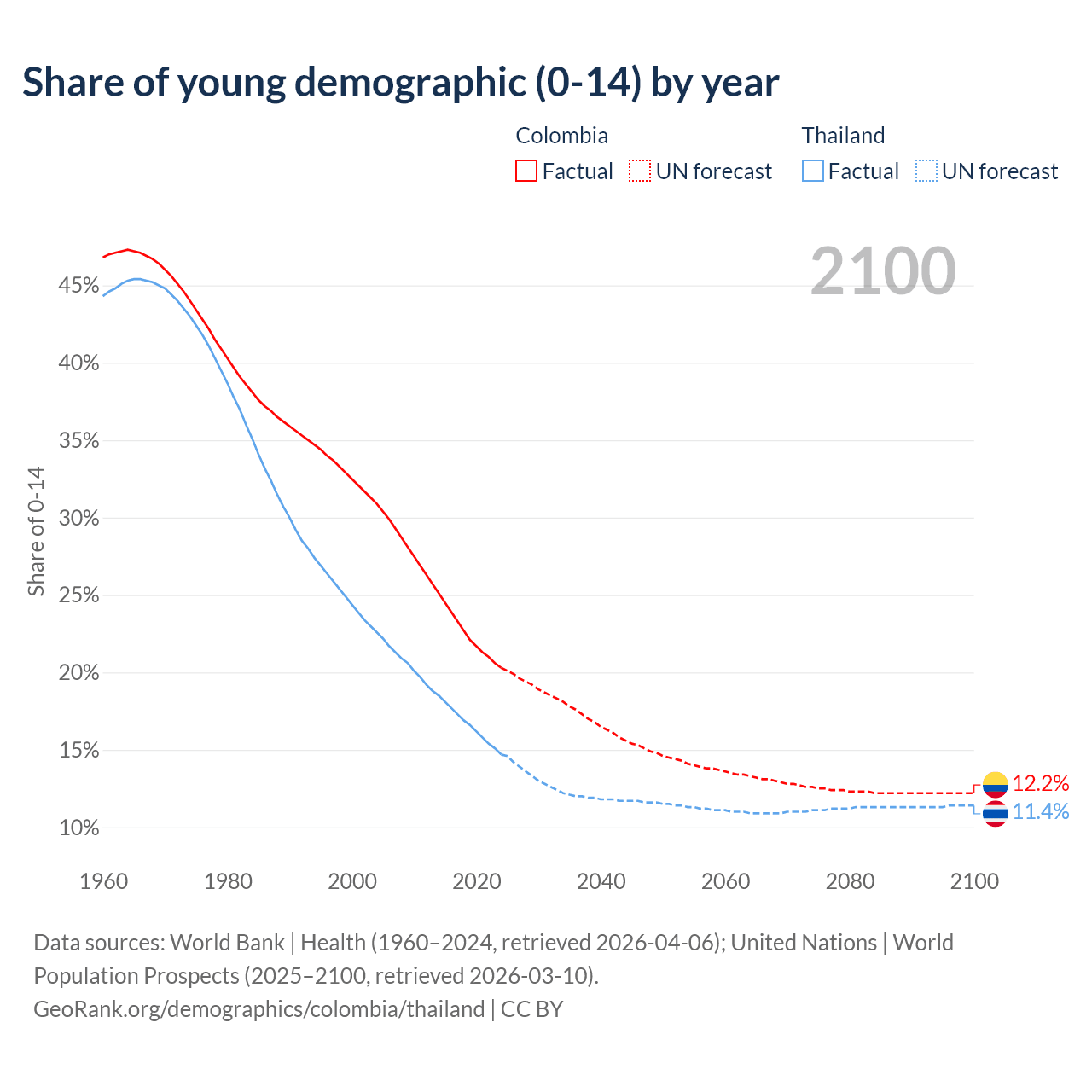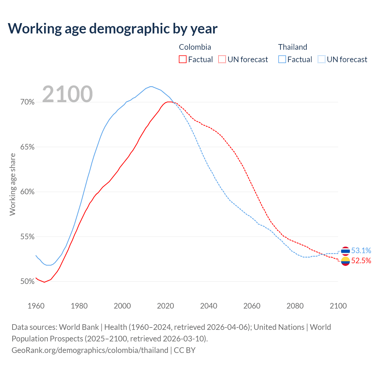 Median age Colombia vs Thailand, 1960-2100