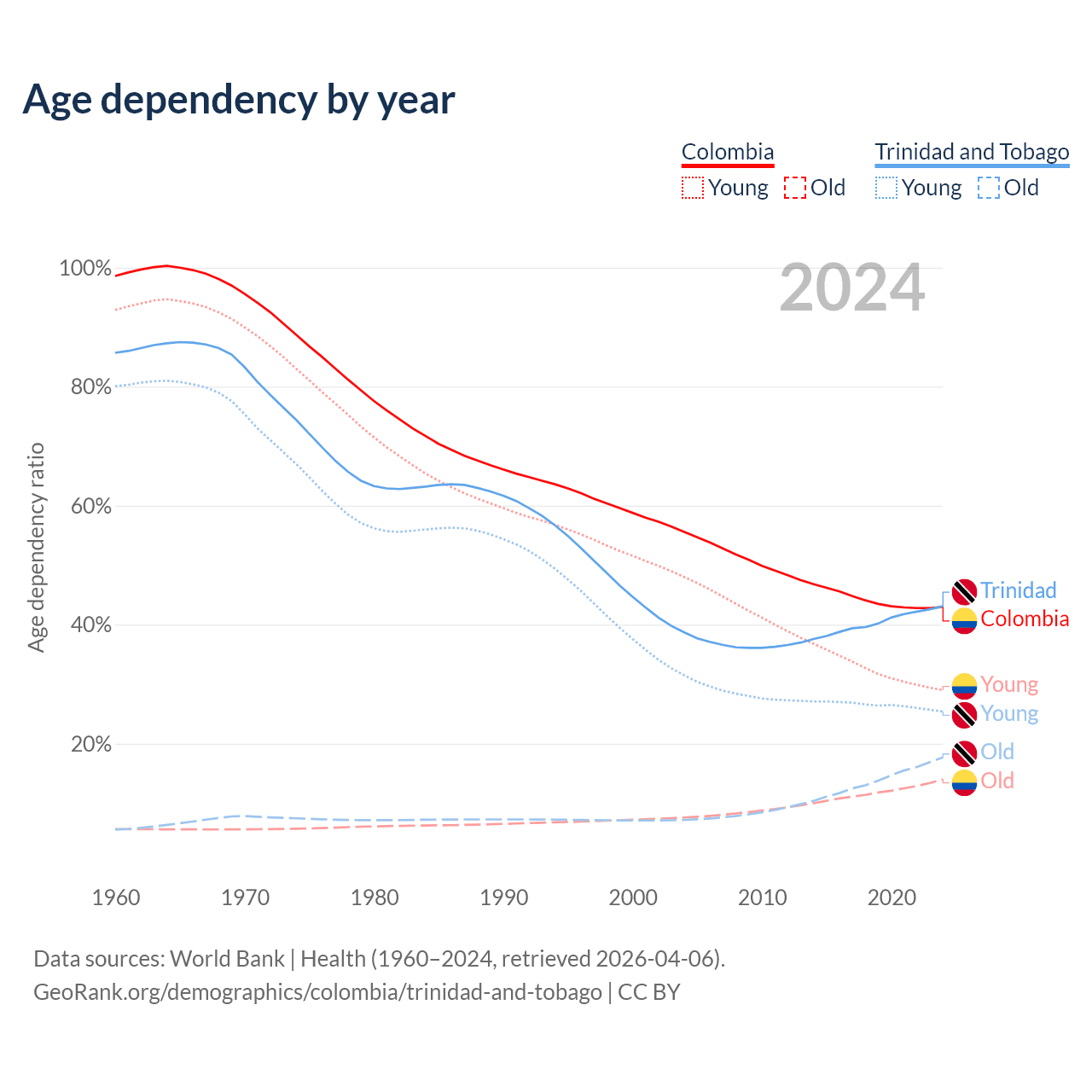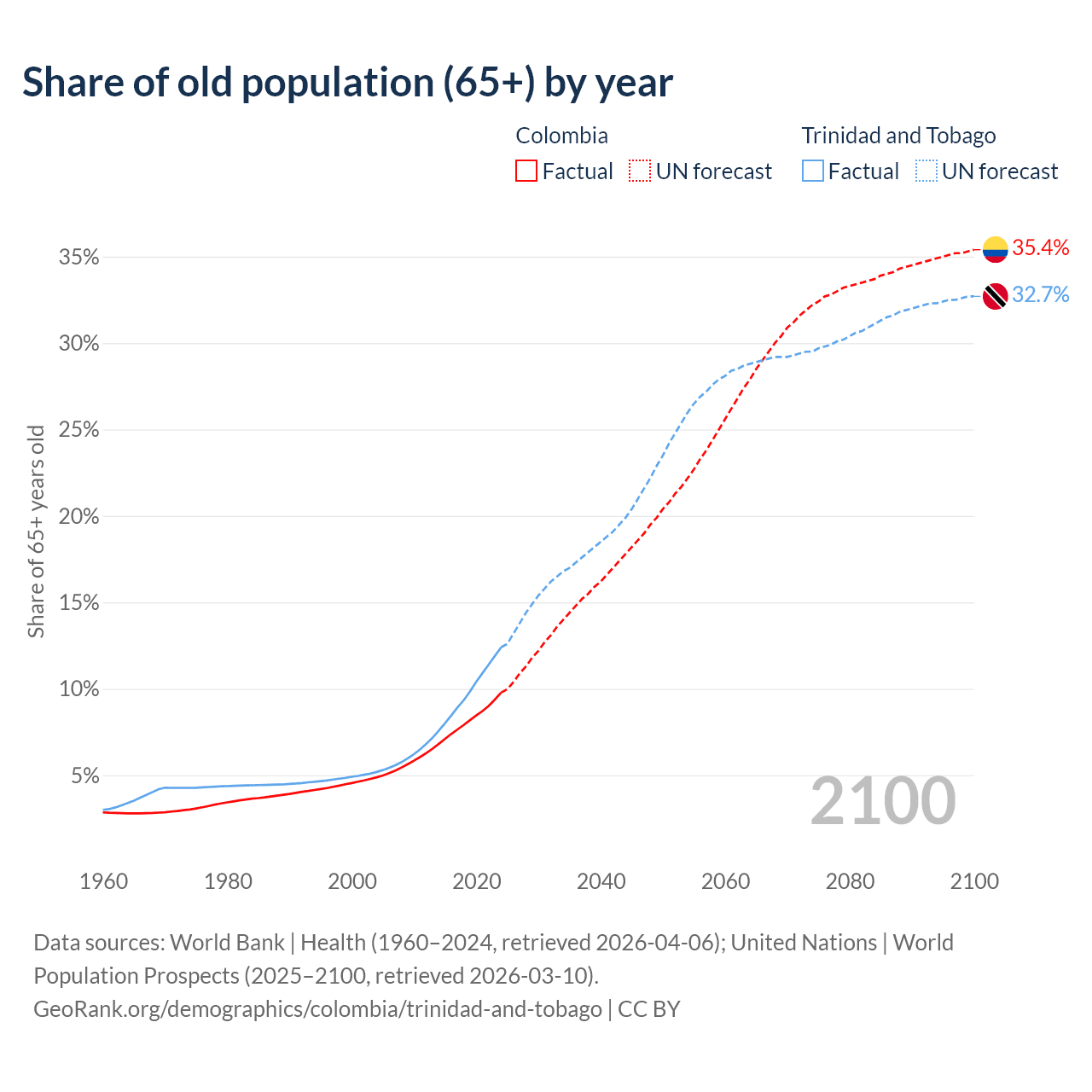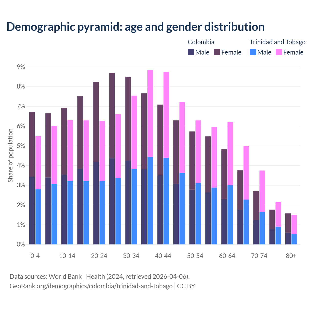 The share of older people aged 65 and over is 9.78% in Colombia and 12.4% in Trinidad and Tobago. Life expectancy in Colombia compared to Trinidad and Tobago .