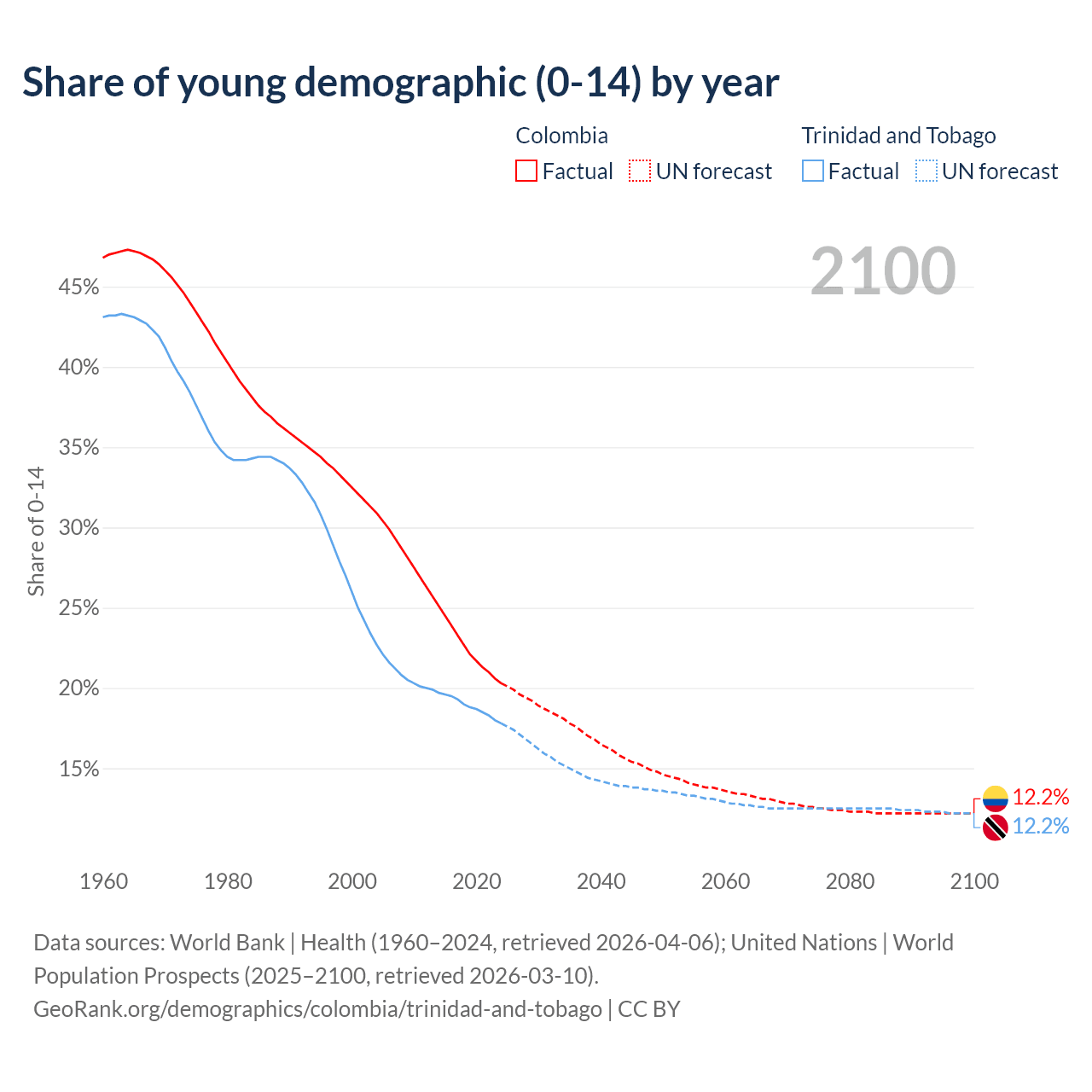 - The share of young demographic (0-15 years old) in Colombia is 20.3% vs 17.8% in Trinidad and Tobago.