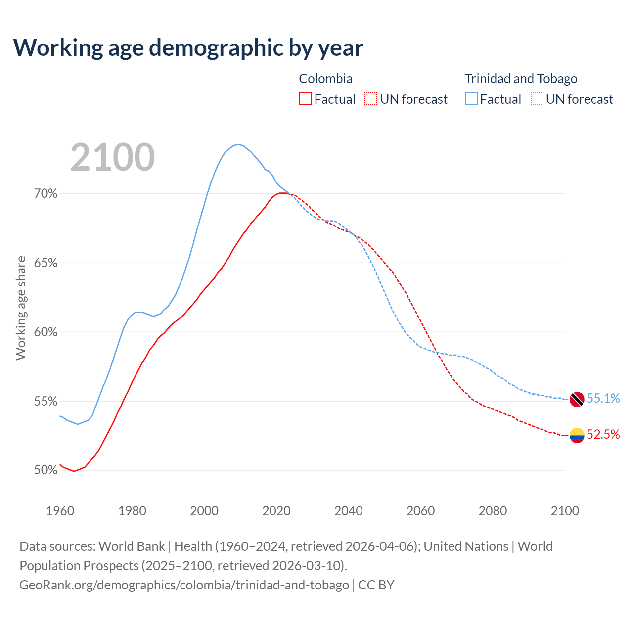 Median age Colombia vs Trinidad and Tobago, 1960-2100