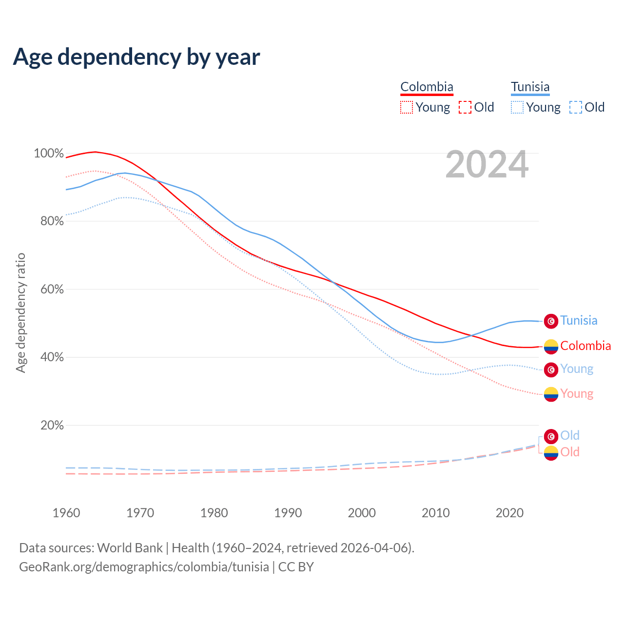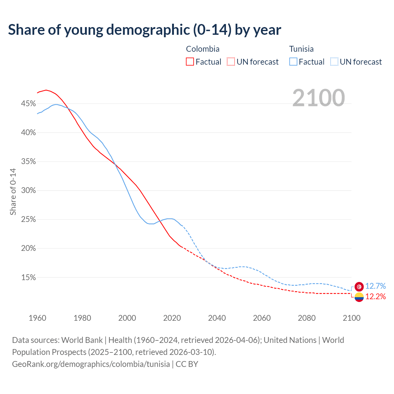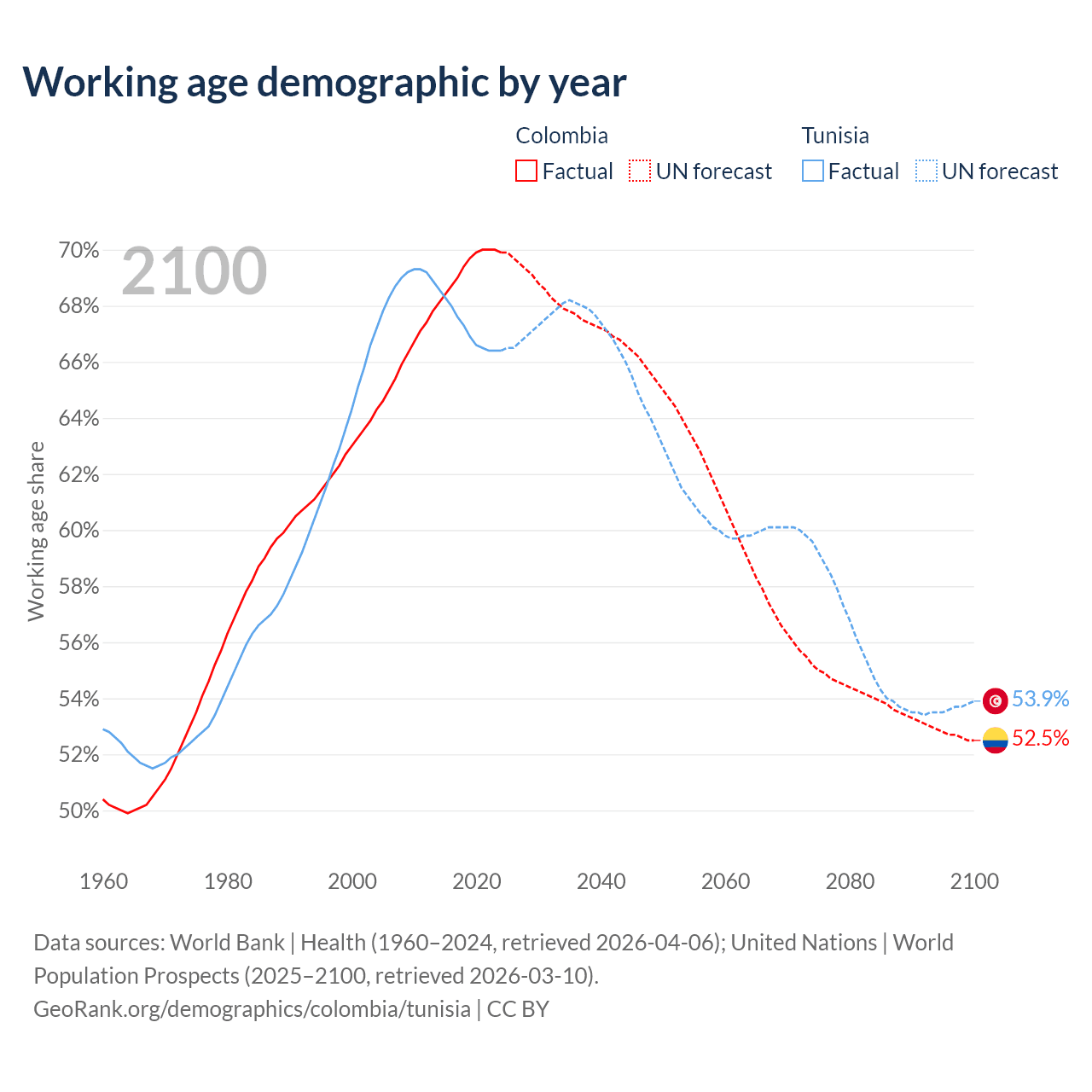 Median age Colombia vs Tunisia, 1960-2100