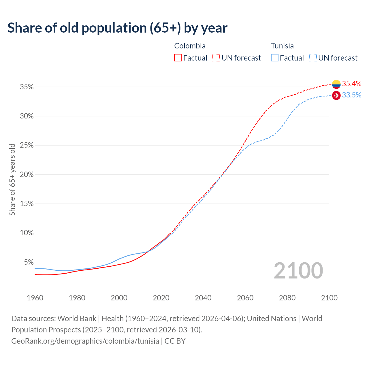 - The share of old-age demographic (65+) in Colombia is 9.78% vs 9.53% in Tunisia.