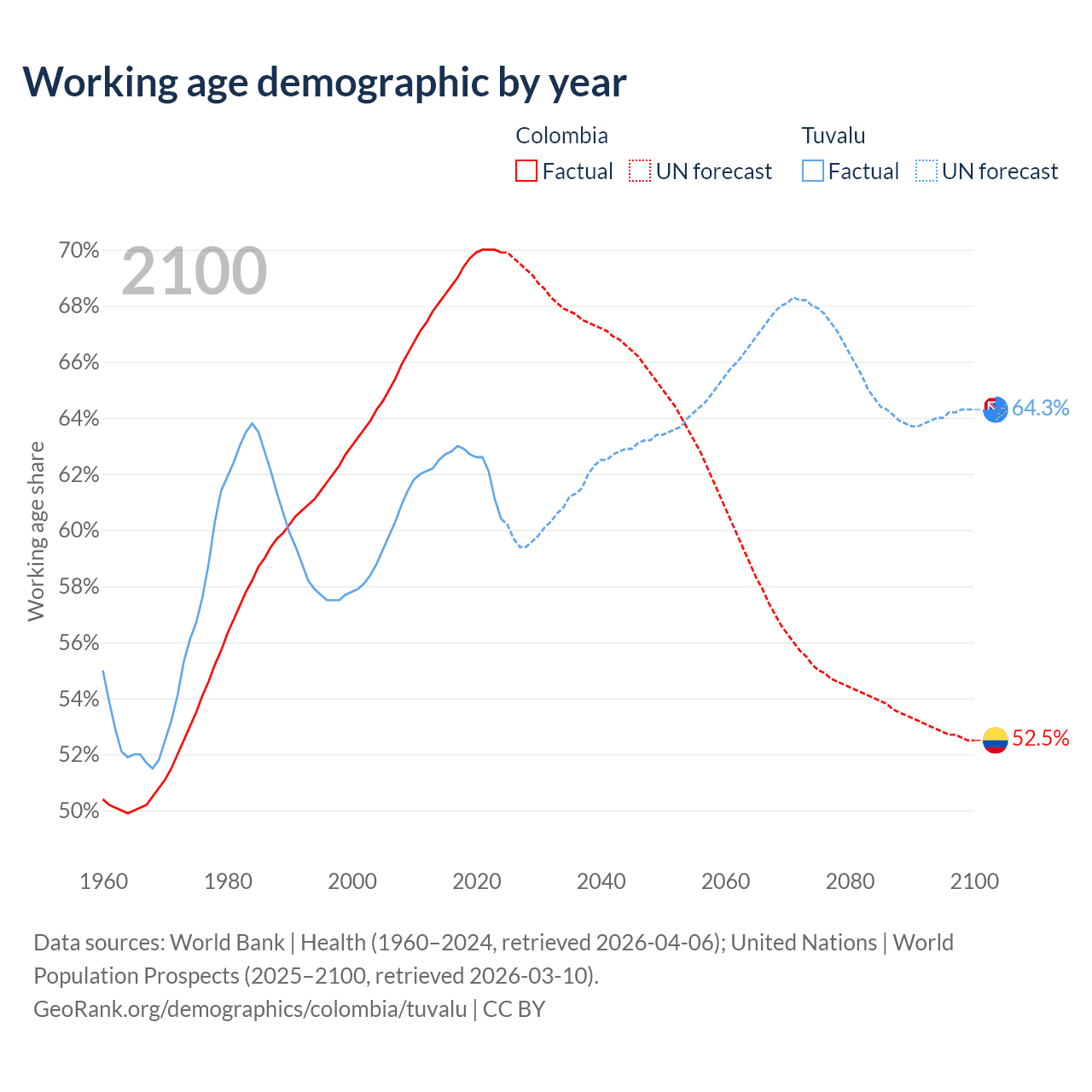 Median age Colombia vs Tuvalu, 1960-2100