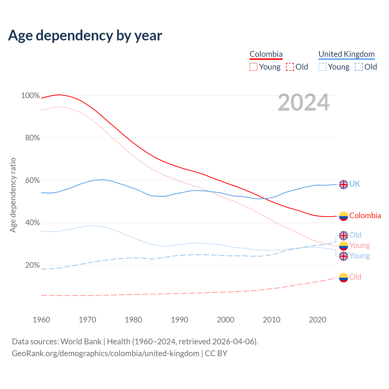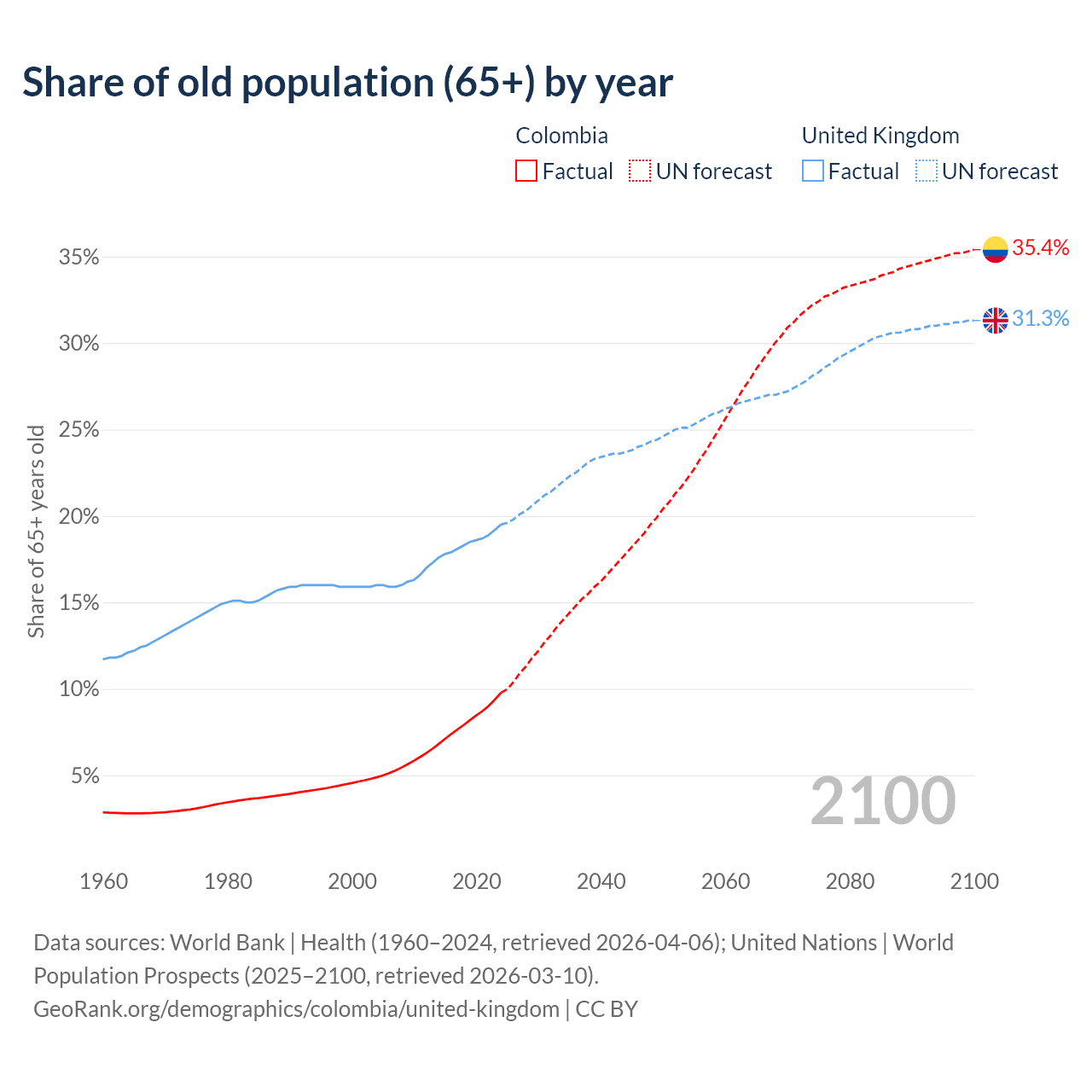 The share of older people aged 65 and over is 9.78% in Colombia and 19.5% in the United Kingdom. Life expectancy in Colombia compared to the United Kingdom .