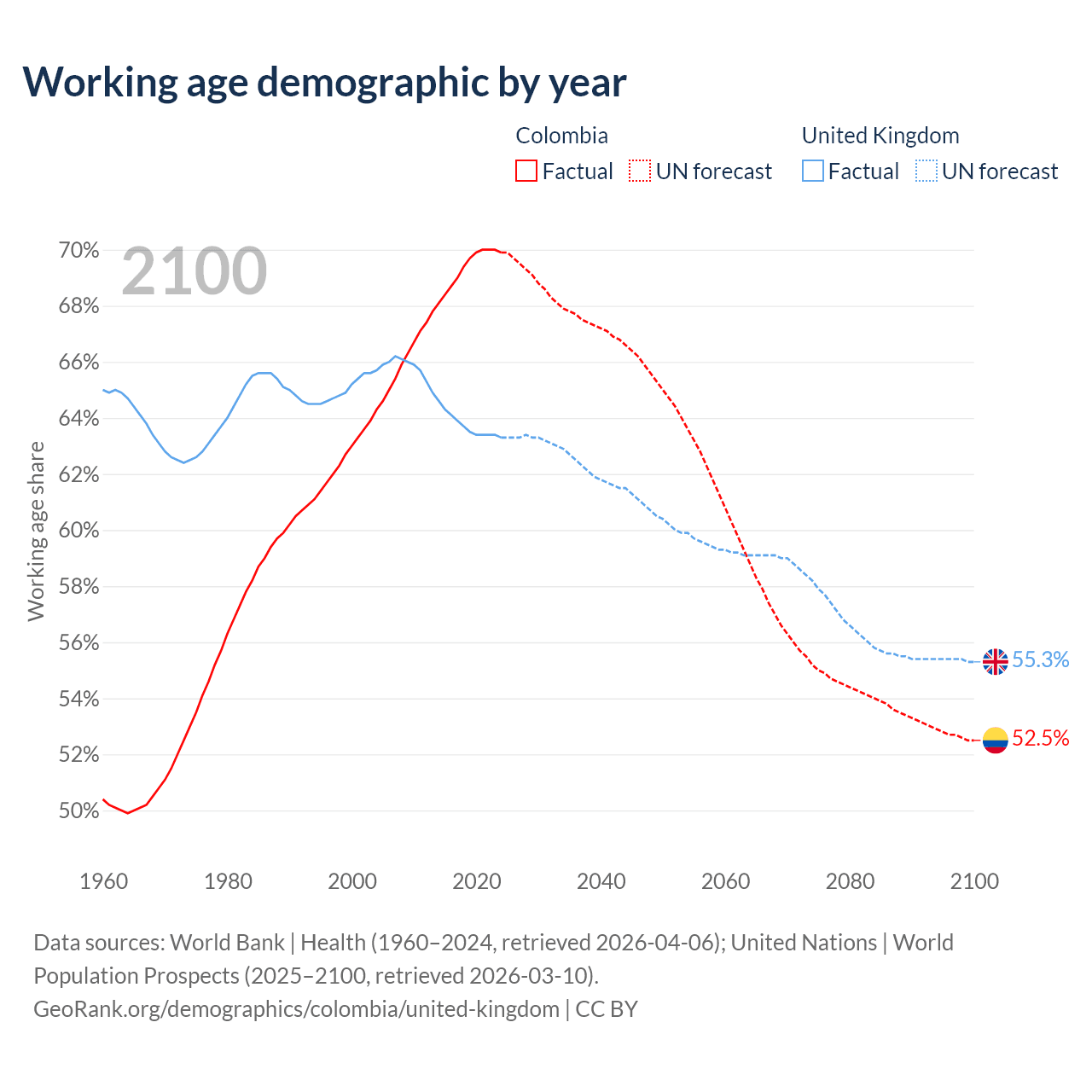 - Colombia has 37.8M working age adults (aged 15-64) vs 44.4M in the United Kingdom.