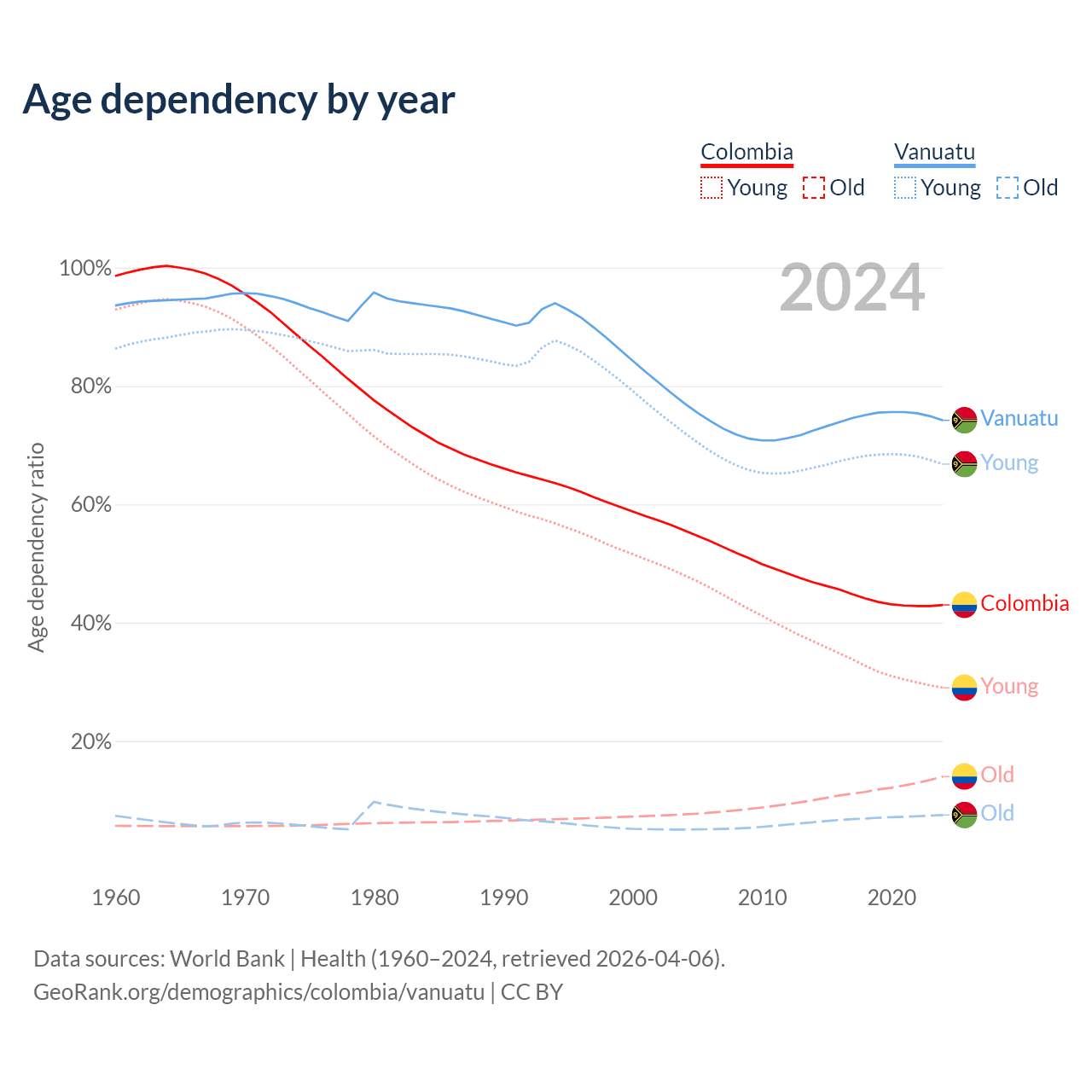 - The share of old-age demographic (65+) in Colombia is 9.78% vs 4.3% in Vanuatu.