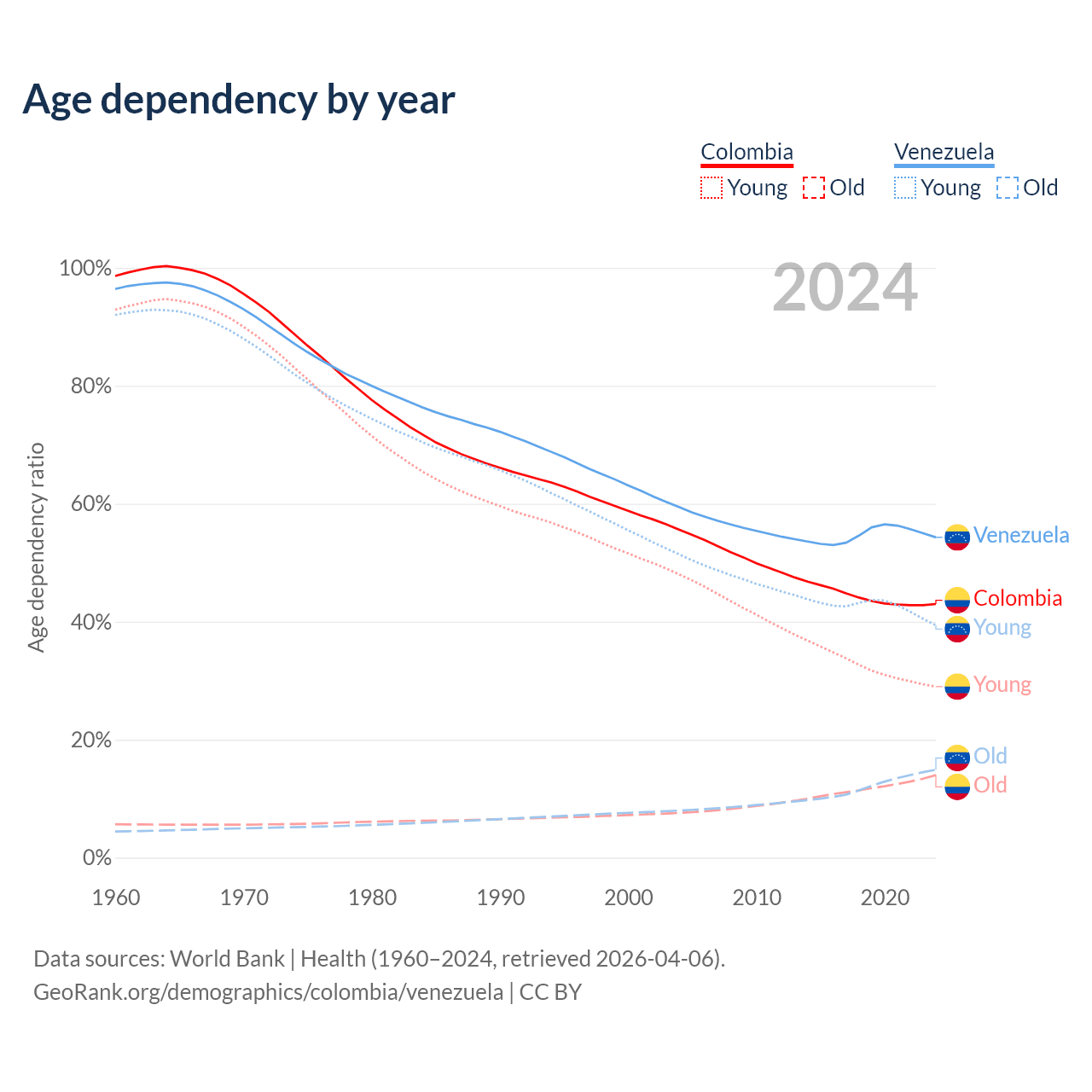 Data sources: World Bank | Health (1960–2024, retrieved 2026-04-06); U.S. Census Bureau (1960–2024, retrieved 2026-02-08).