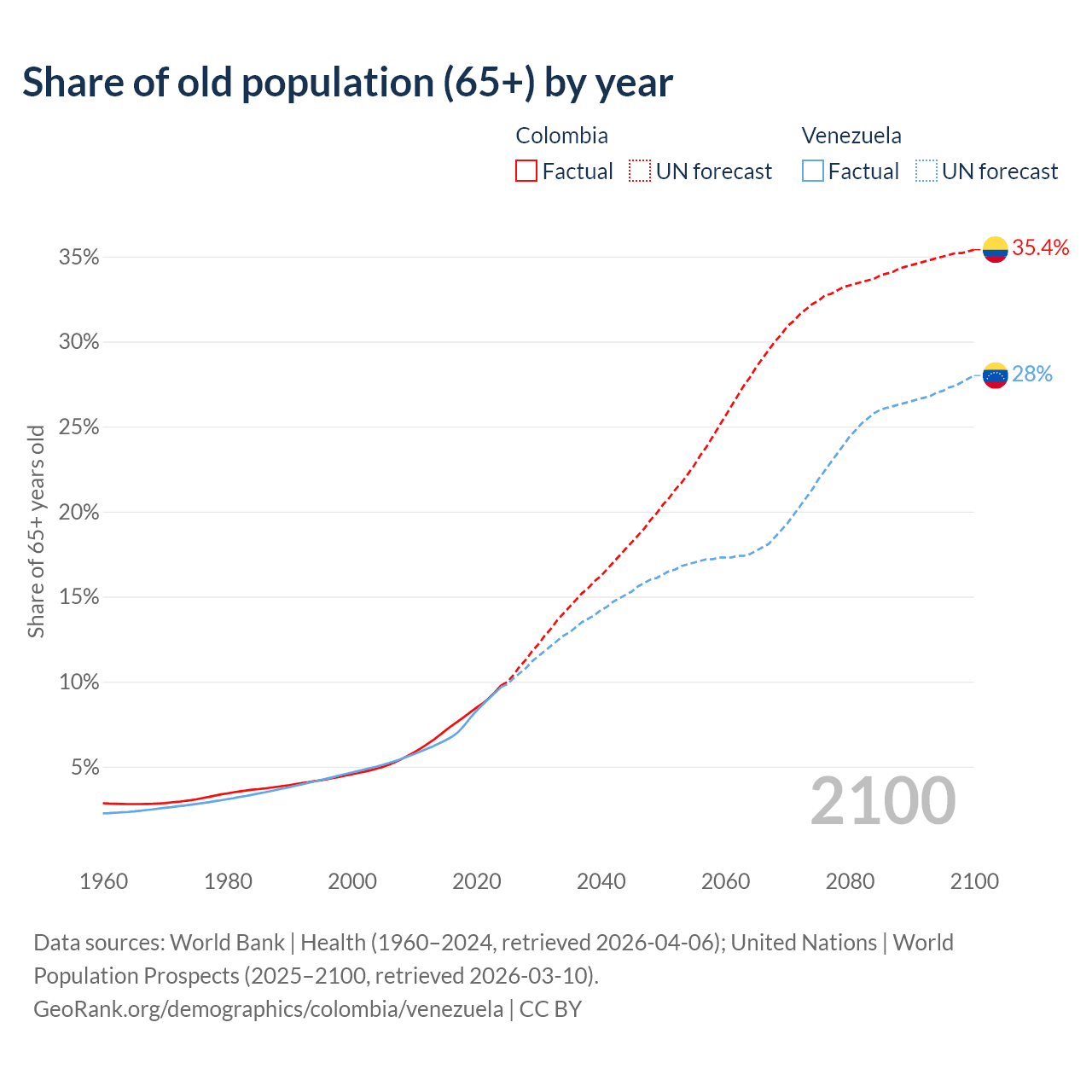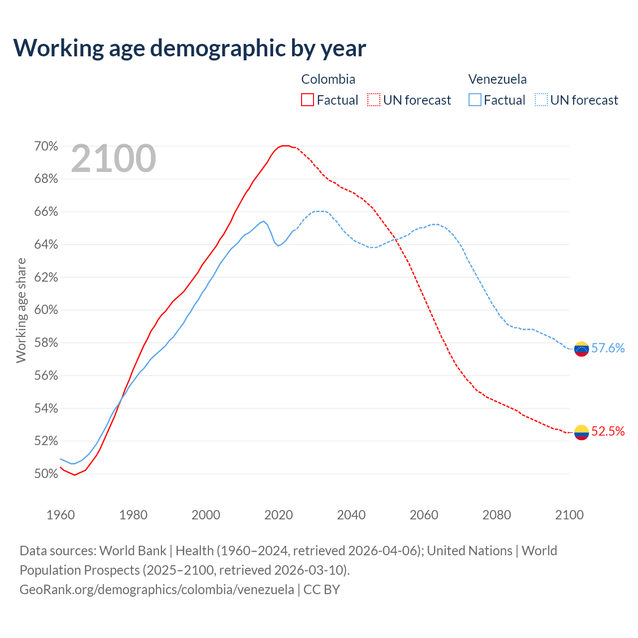 Median age Colombia vs Venezuela, 1960-2100