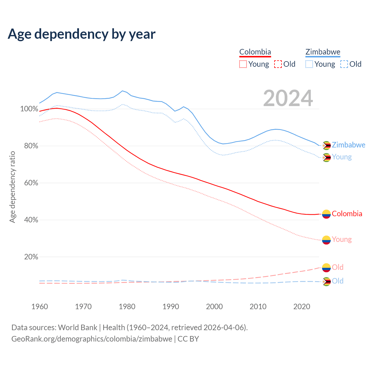 - The share of old-age demographic (65+) in Colombia is 9.78% vs 3.6% in Zimbabwe.
