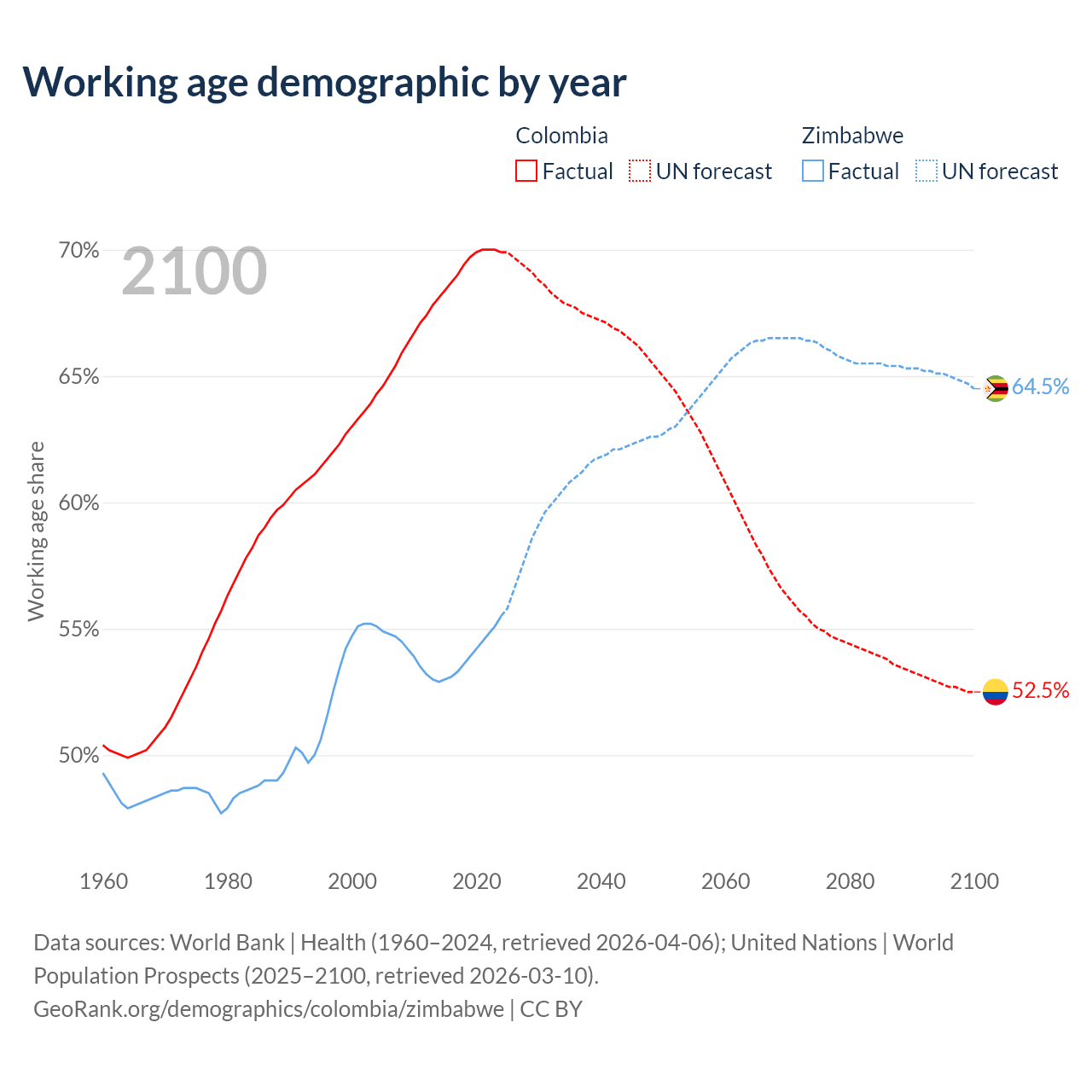 Median age Colombia vs Zimbabwe, 1960-2100