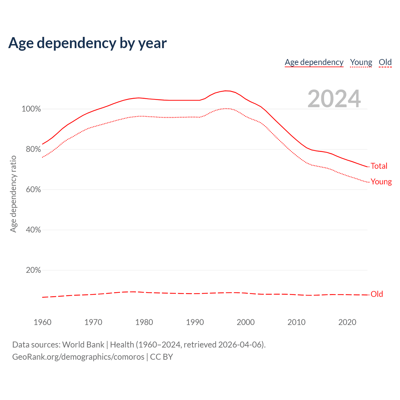 Data sources: World Bank | Health (1960–2024, retrieved 2026-04-06); U.S. Census Bureau (1960–2024, retrieved 2026-02-08).