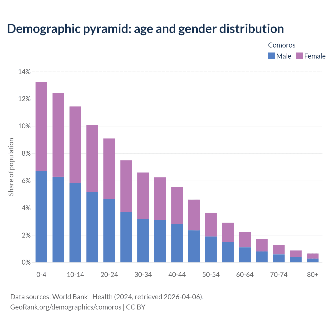 With a population of 867K people, Comoros has a median age of 21.5 years which makes it the 152/196 oldest country. 37.1% of the demographic are children 0-14 years old, 58.4% are working-age people aged 15-64, and 4.47% are older population aged 65+ years.