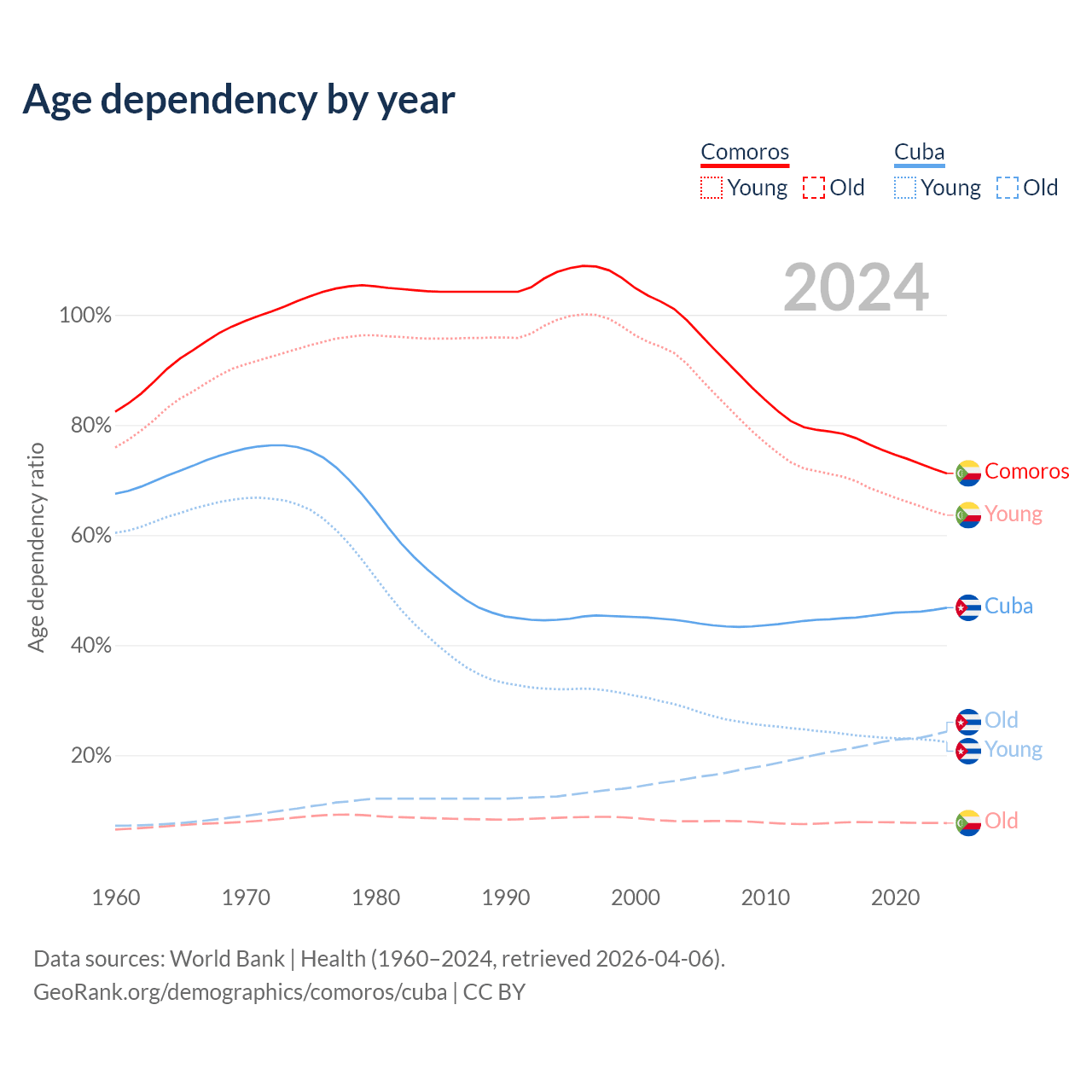 - Comoros is ranked 152/196 by median age (oldest to youngest) vs 27/196 for Cuba.