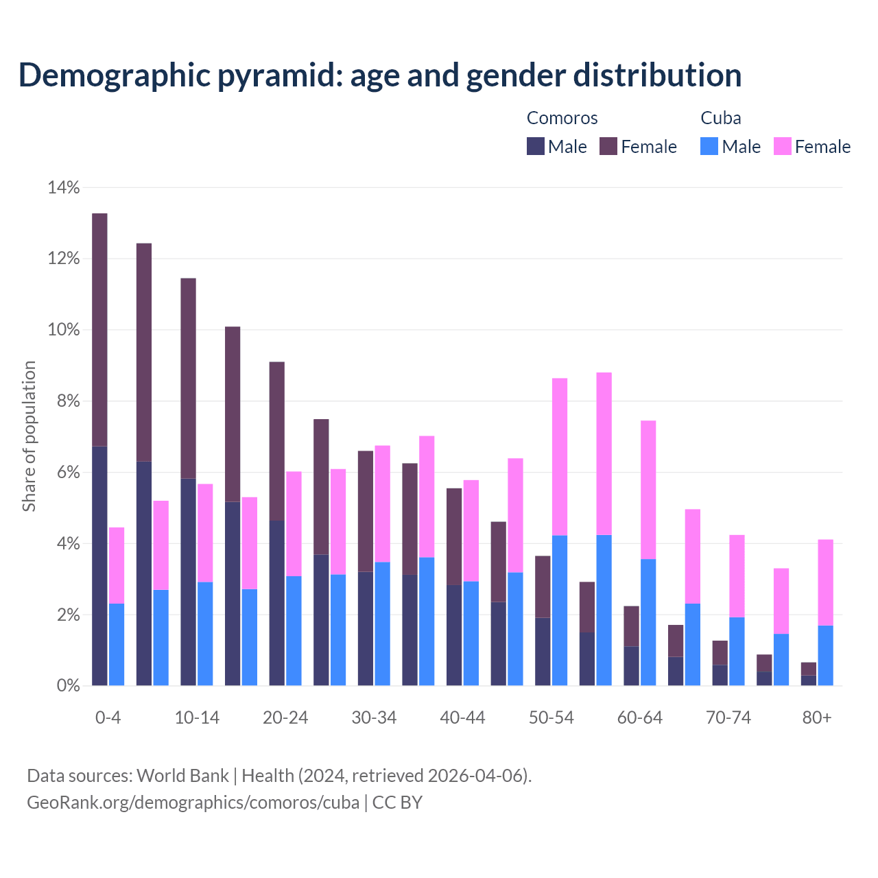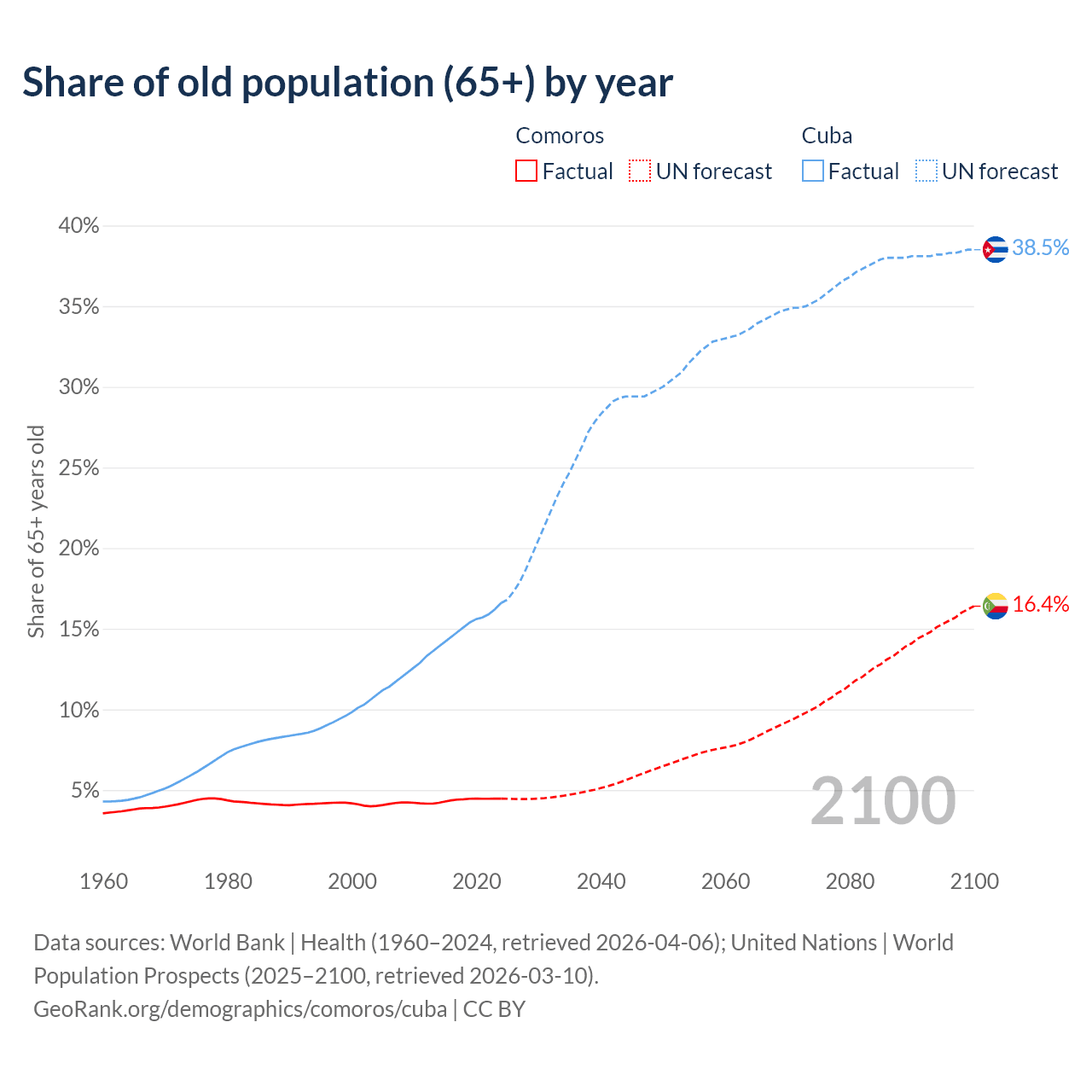 - The share of old-age demographic (65+) in Comoros is 4.47% vs 16.6% in Cuba.