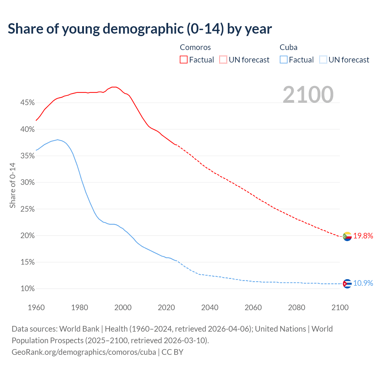 - The share of young demographic (0-15 years old) in Comoros is 37.1% vs 15.3% in Cuba.