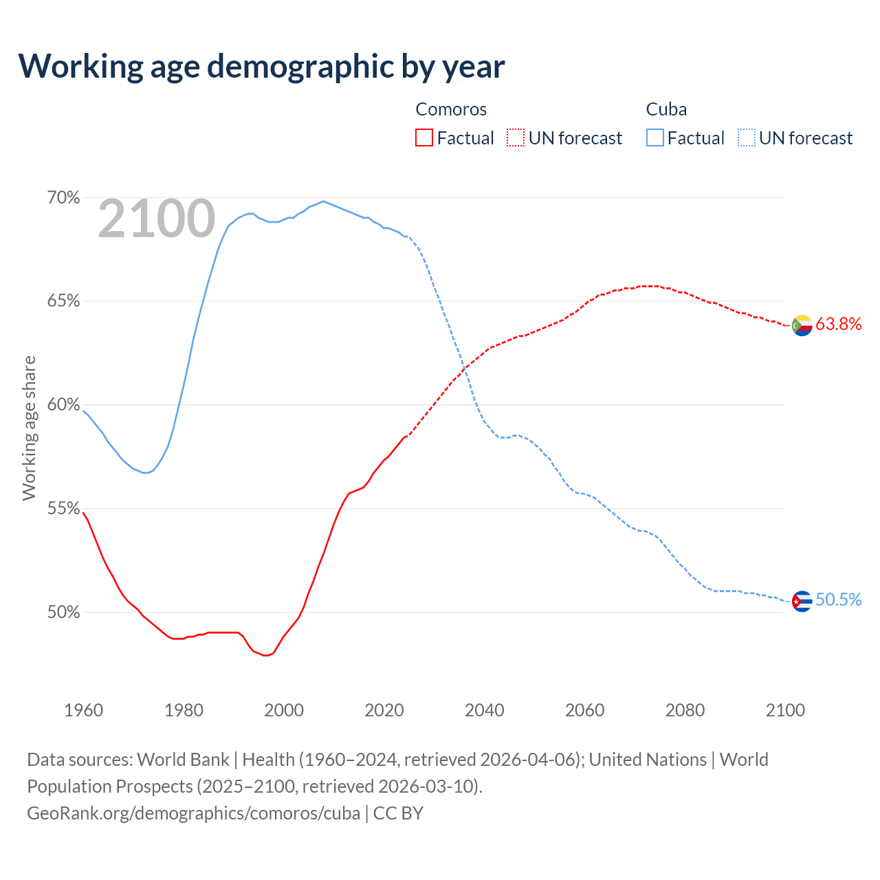 - Comoros has 528K working age adults (aged 15-64) vs 7.42M in Cuba.