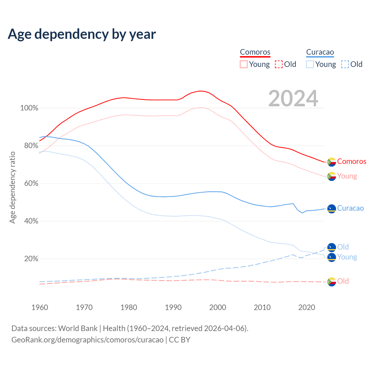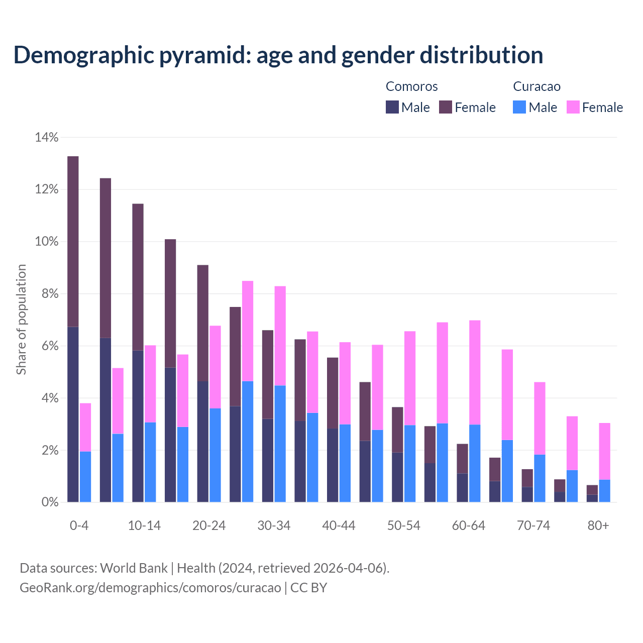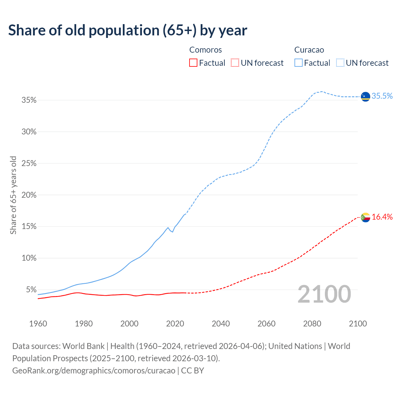 - The share of old-age demographic (65+) in Comoros is 4.47% vs 16.8% in Curacao.