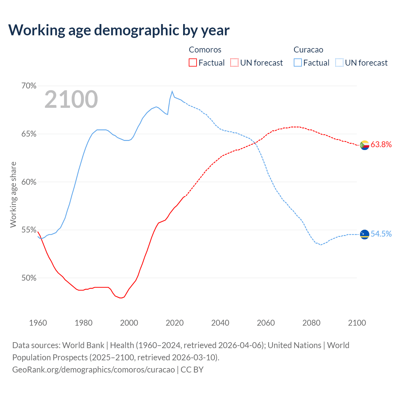 - Comoros has 528K working age adults (aged 15-64) vs 107K in Curacao.