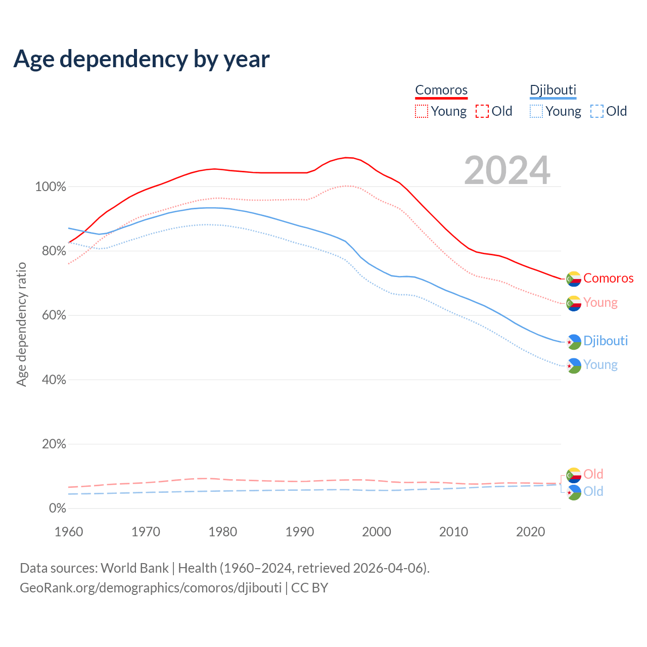 - Comoros is ranked 152/196 by median age (oldest to youngest) vs 129/196 for Djibouti.