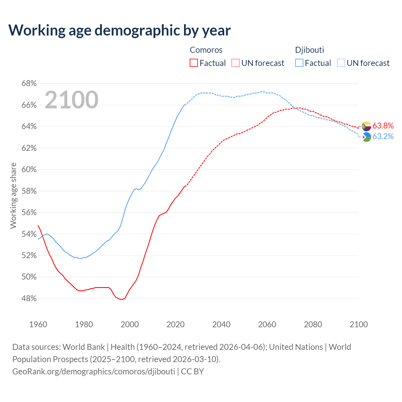 Median age Comoros vs Djibouti, 1960-2100