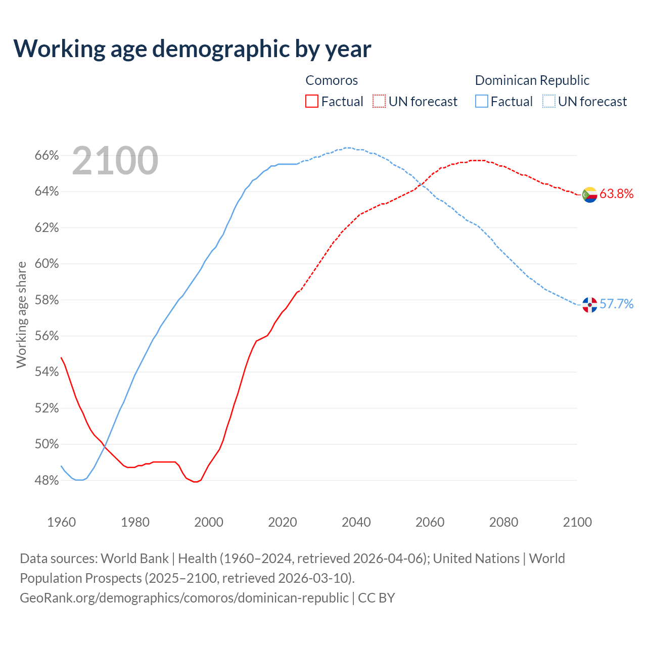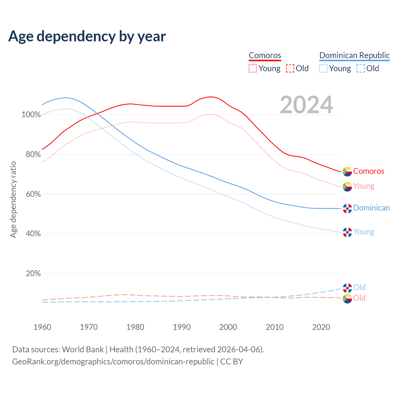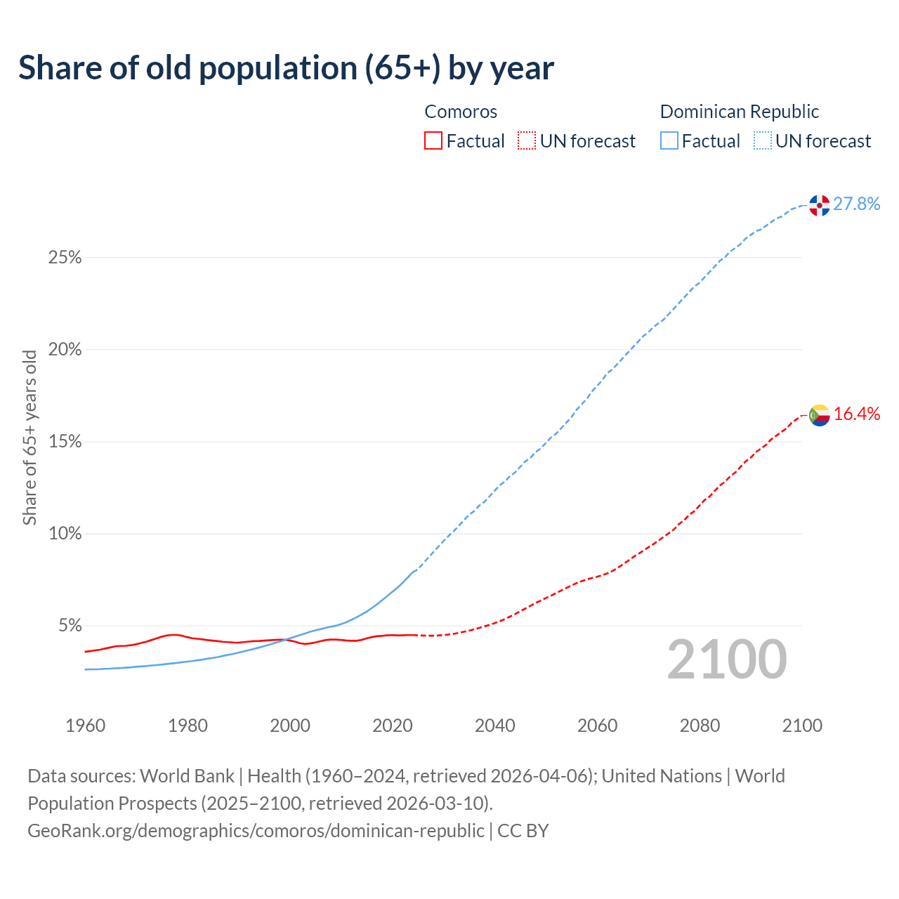 - The share of old-age demographic (65+) in Comoros is 4.47% vs 7.88% in the Dominican Republic.