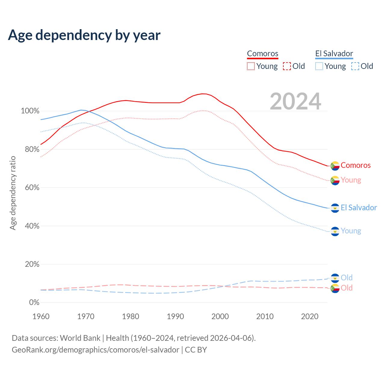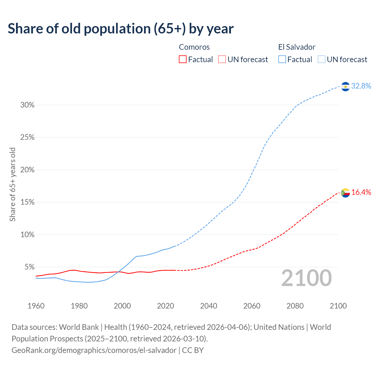 - The share of old-age demographic (65+) in Comoros is 4.47% vs 8.15% in El Salvador.