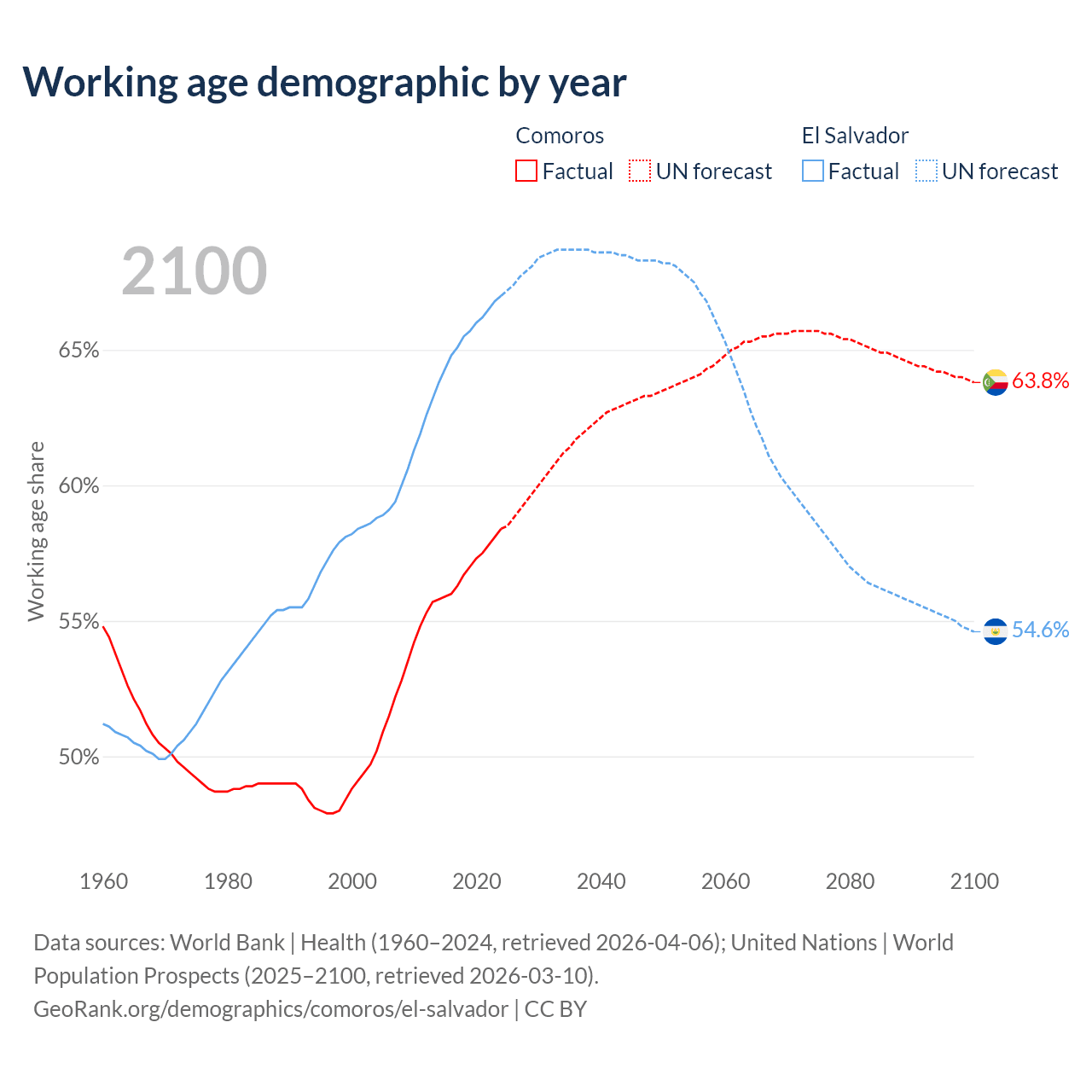 - Comoros has 528K working age adults (aged 15-64) vs 4.29M in El Salvador.