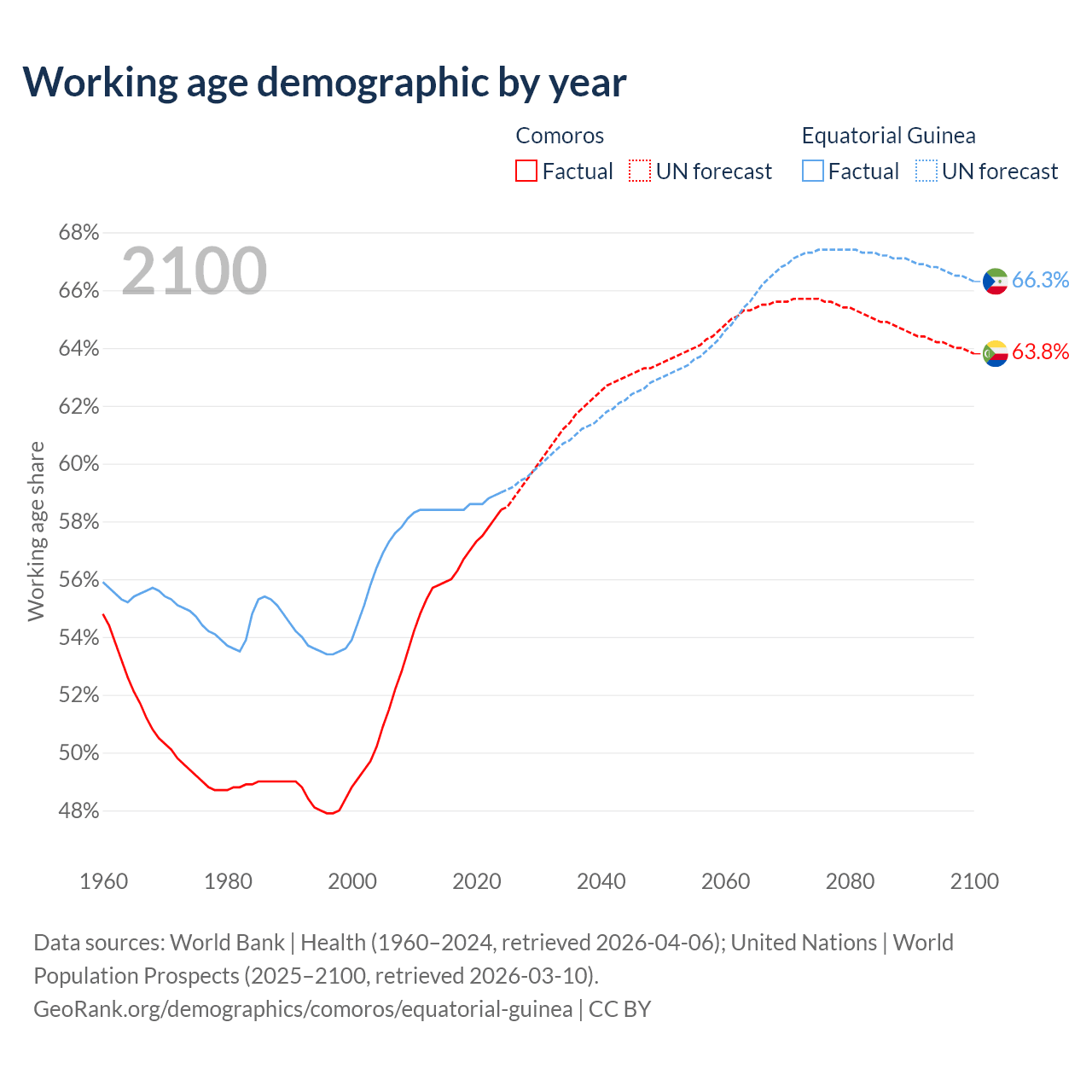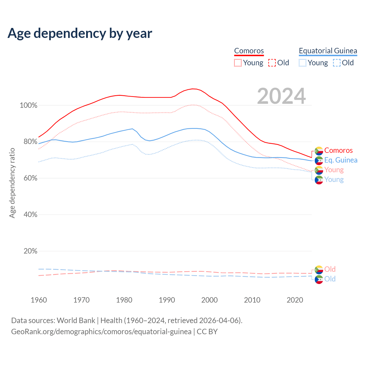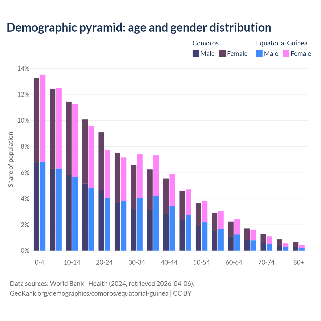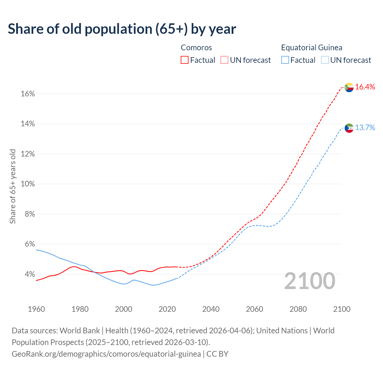 - The share of old-age demographic (65+) in Comoros is 4.47% vs 3.69% in Equatorial Guinea.
