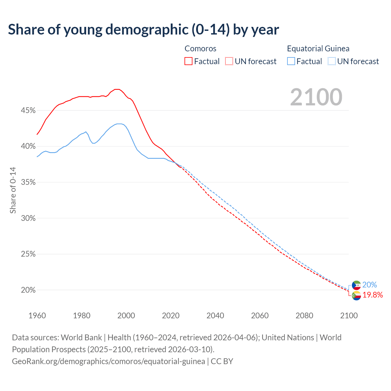 - The share of young demographic (0-15 years old) in Comoros is 37.1% vs 37.3% in Equatorial Guinea.