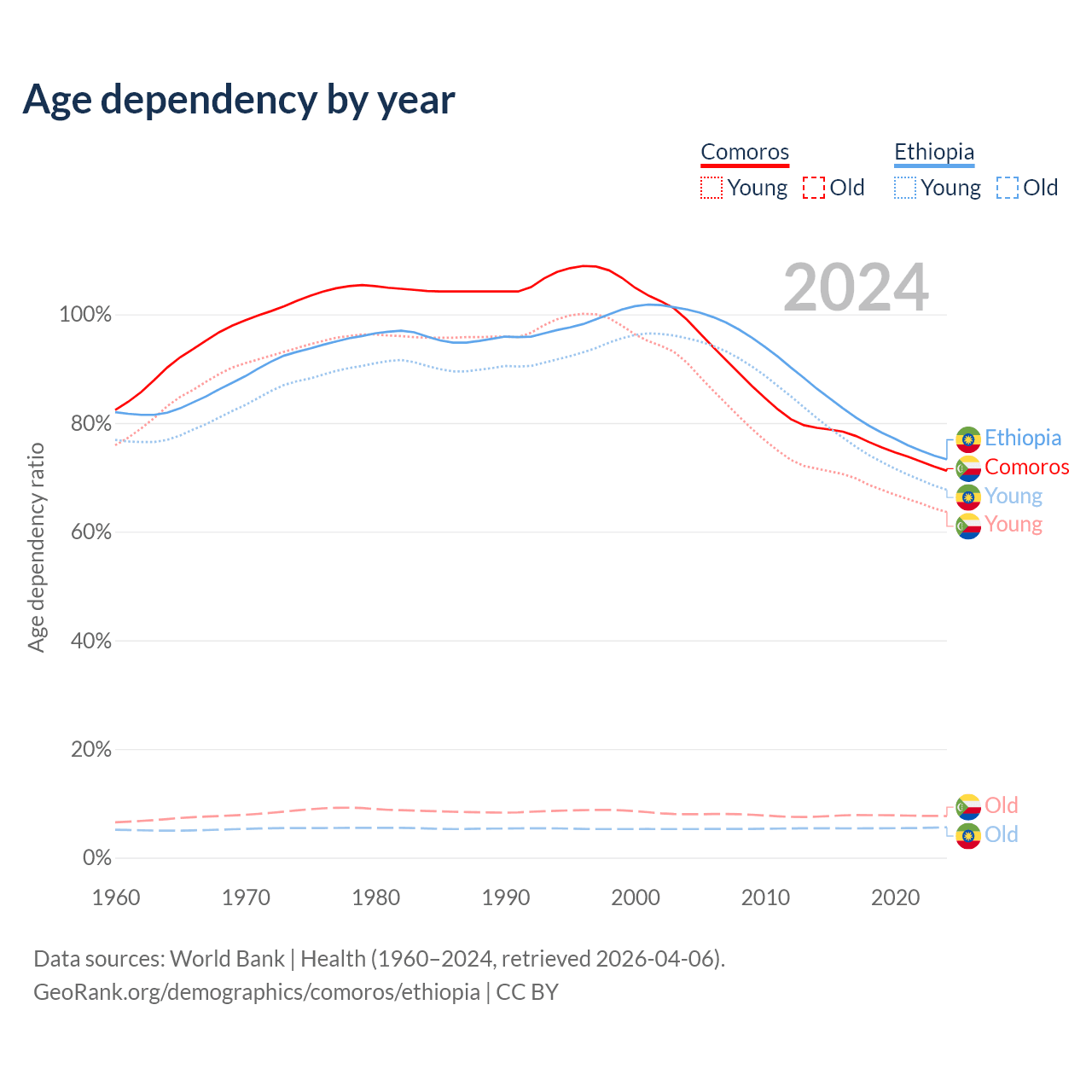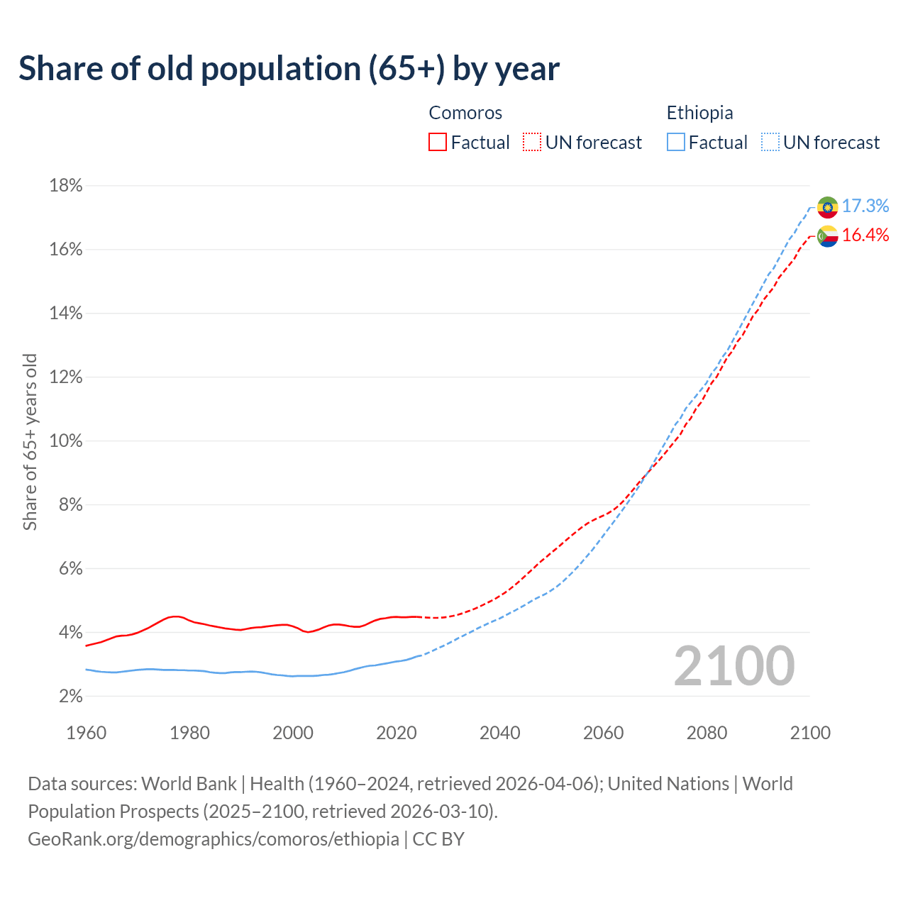 - The share of old-age demographic (65+) in Comoros is 4.47% vs 3.23% in Ethiopia.