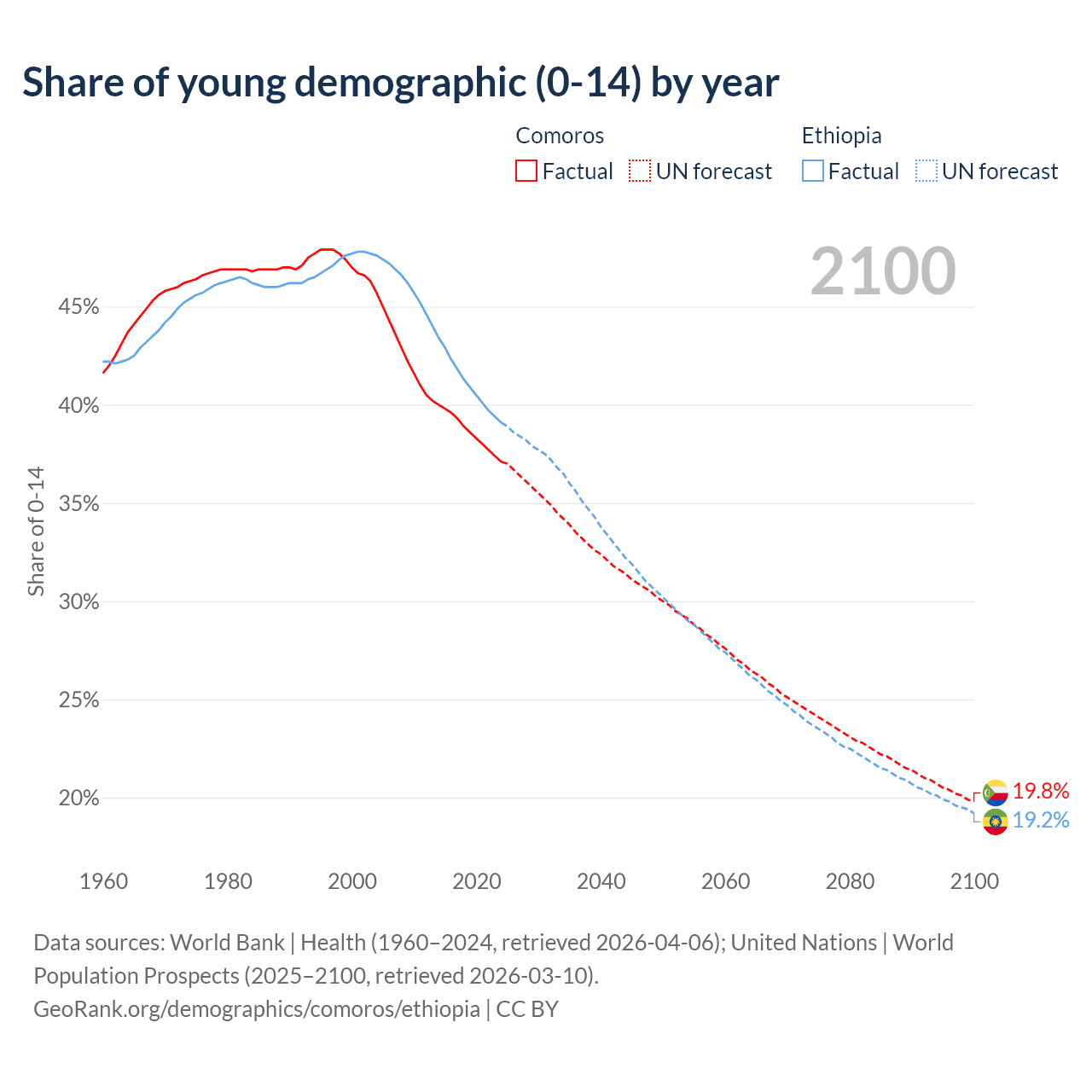 - The share of young demographic (0-15 years old) in Comoros is 37.1% vs 39.1% in Ethiopia.