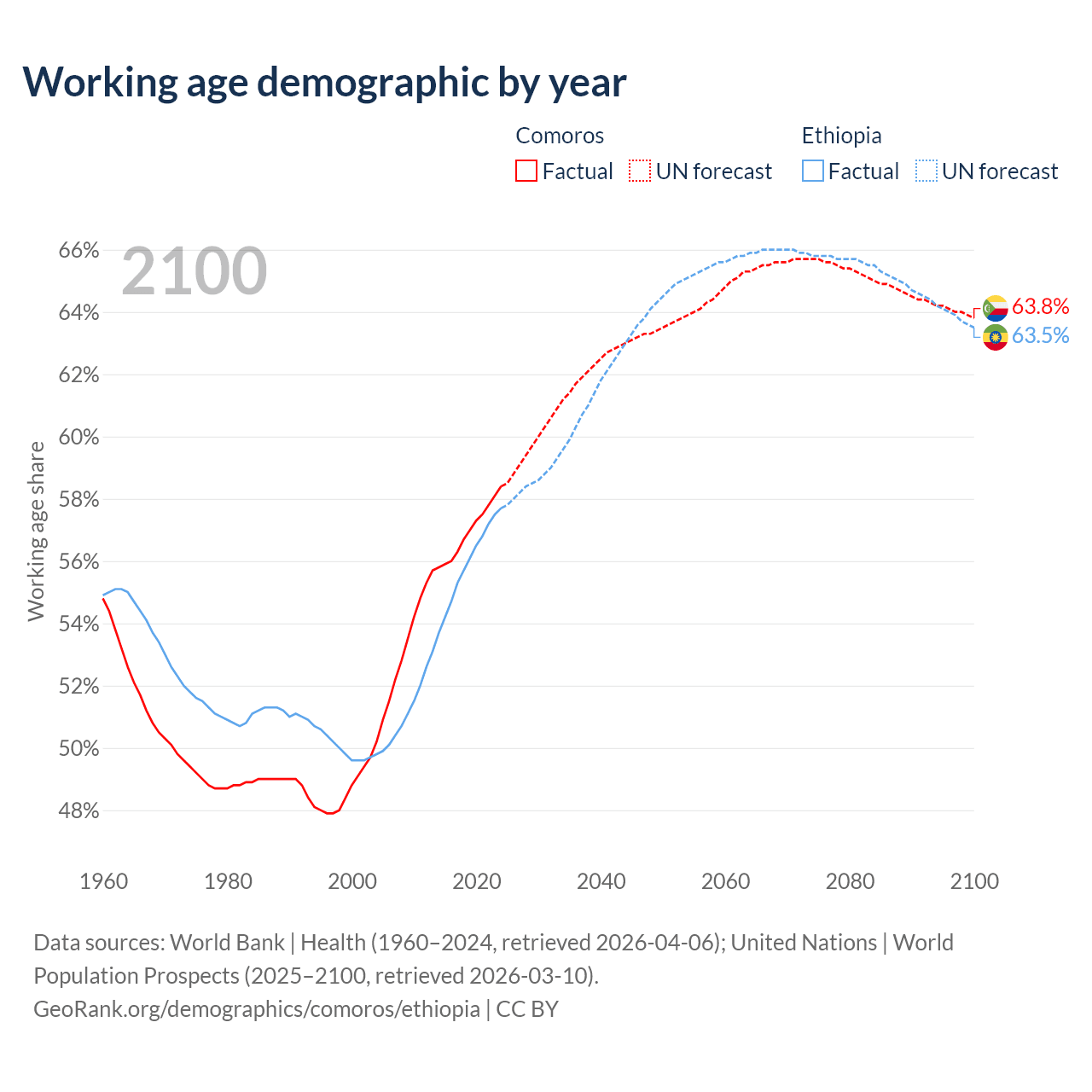 - Comoros has 528K working age adults (aged 15-64) vs 80.7M in Ethiopia.