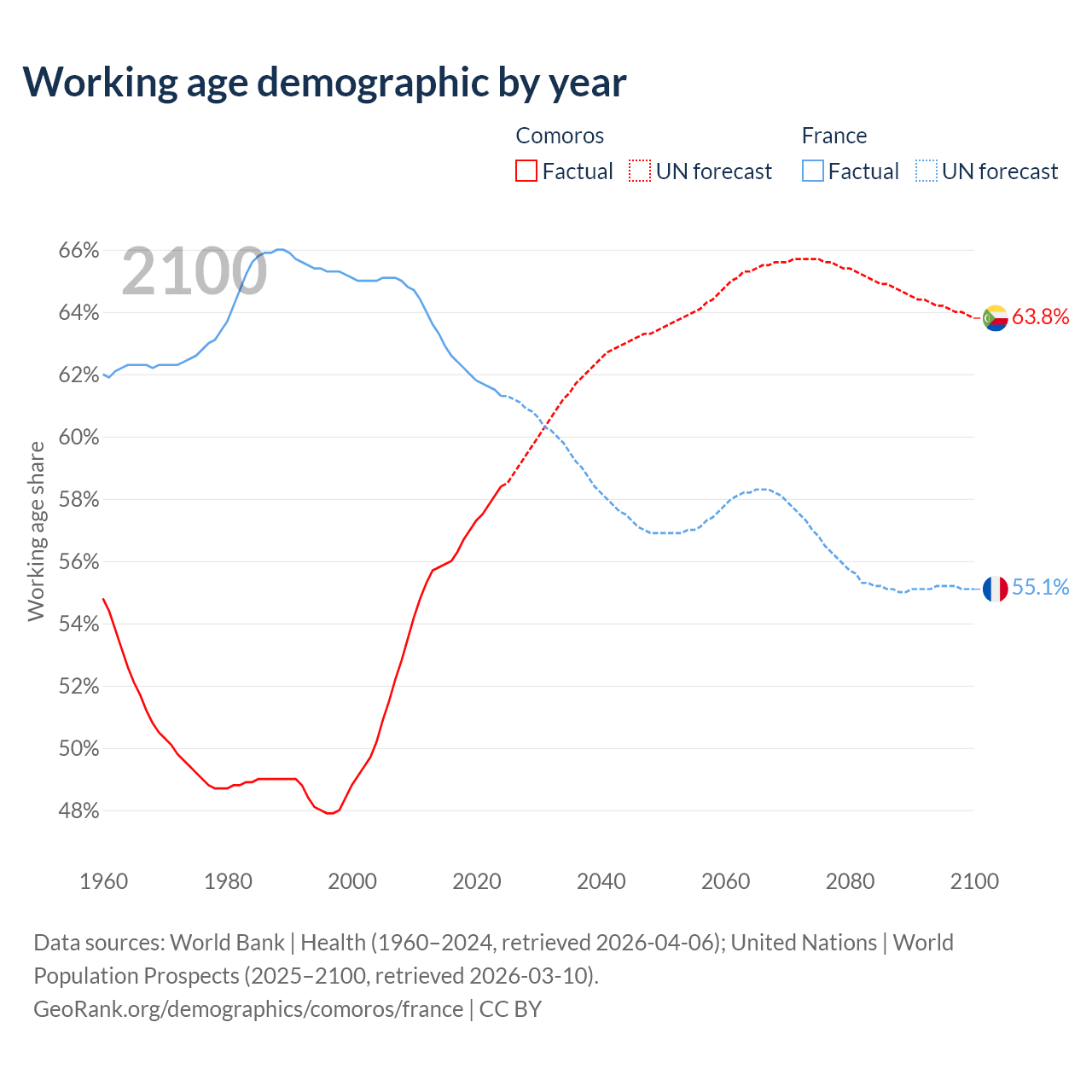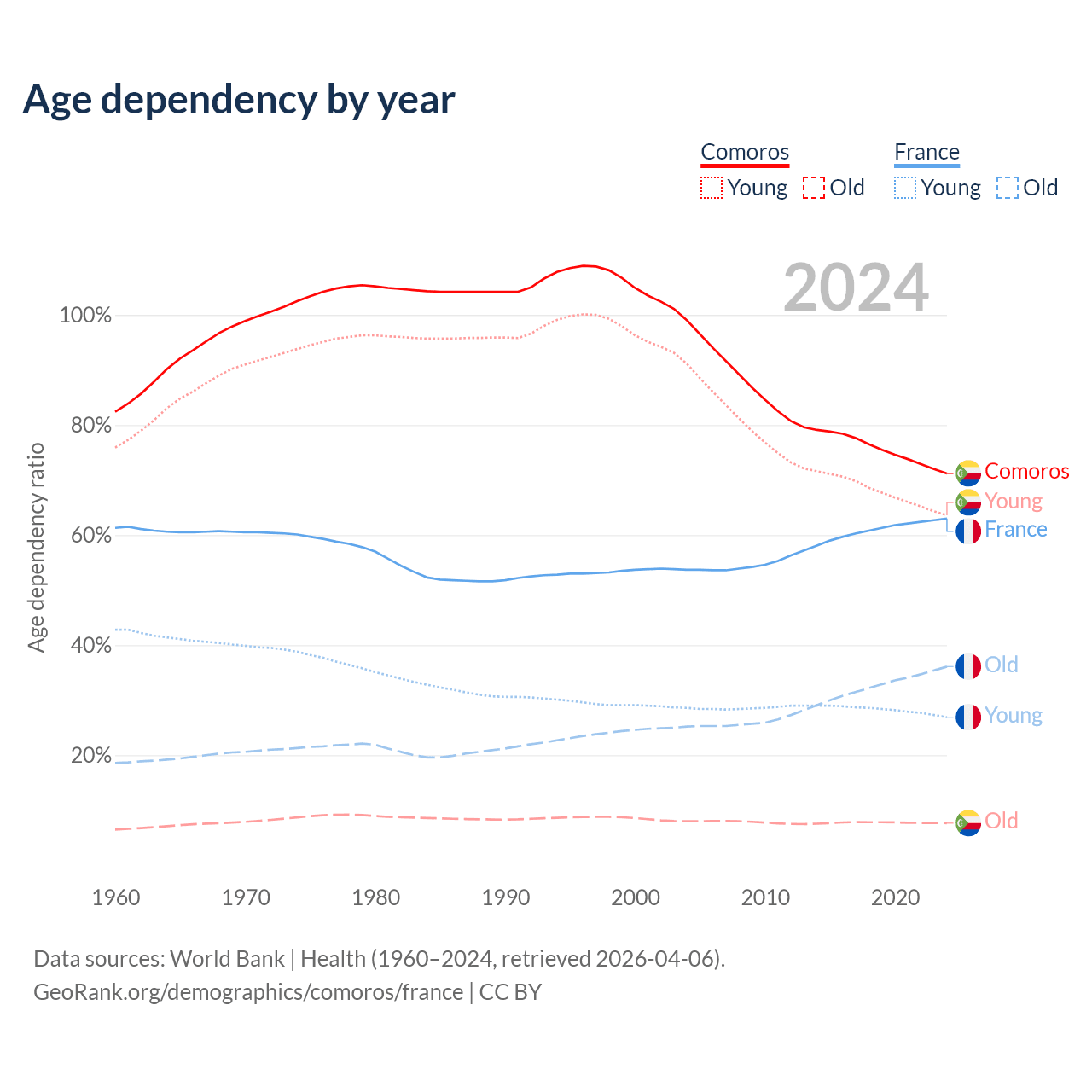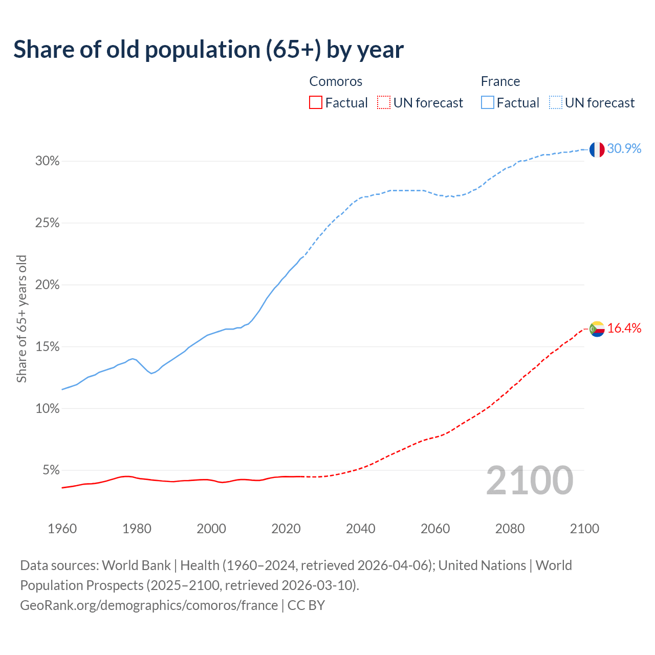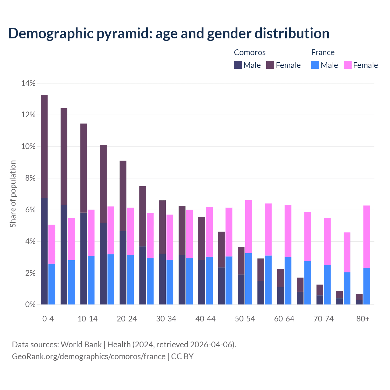 - The share of old-age demographic (65+) in Comoros is 4.47% vs 22.1% in France.