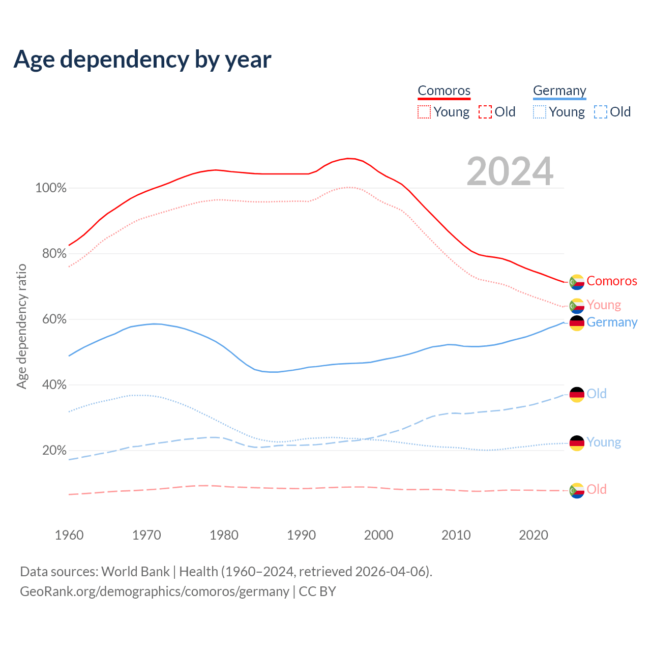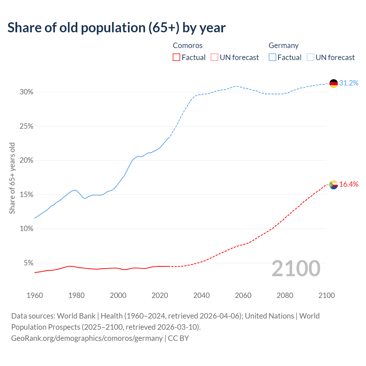 - The share of old-age demographic (65+) in Comoros is 4.47% vs 23.2% in Germany.