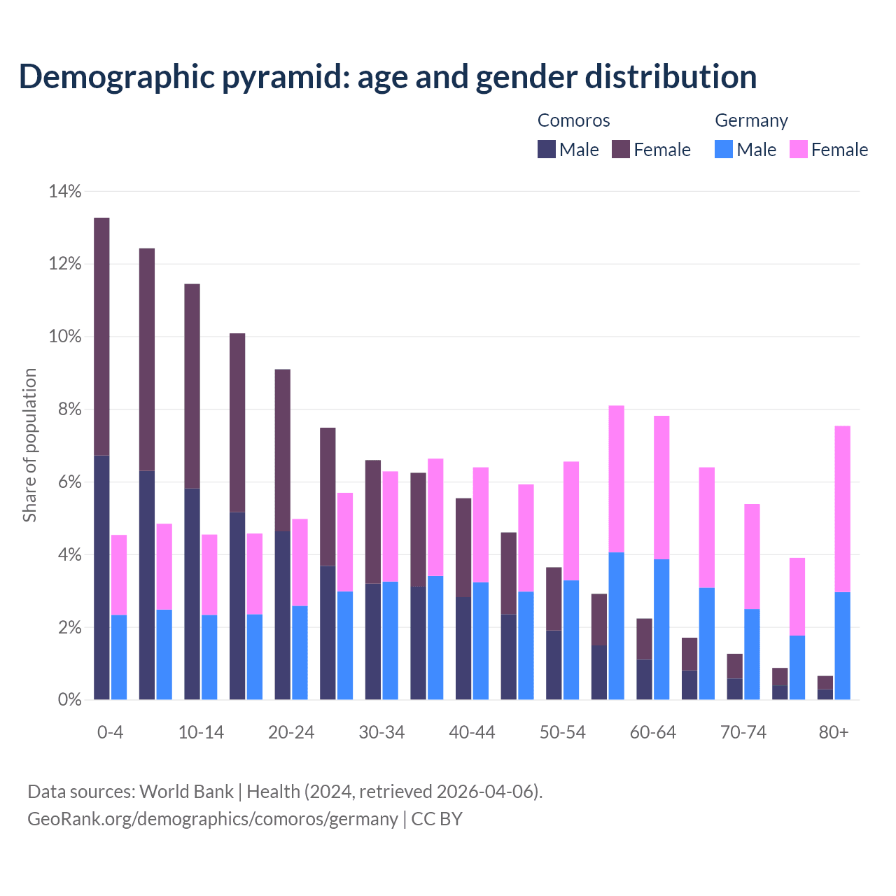 - Comoros is ranked 152/196 by median age (oldest to youngest) vs 9/196 for Germany.