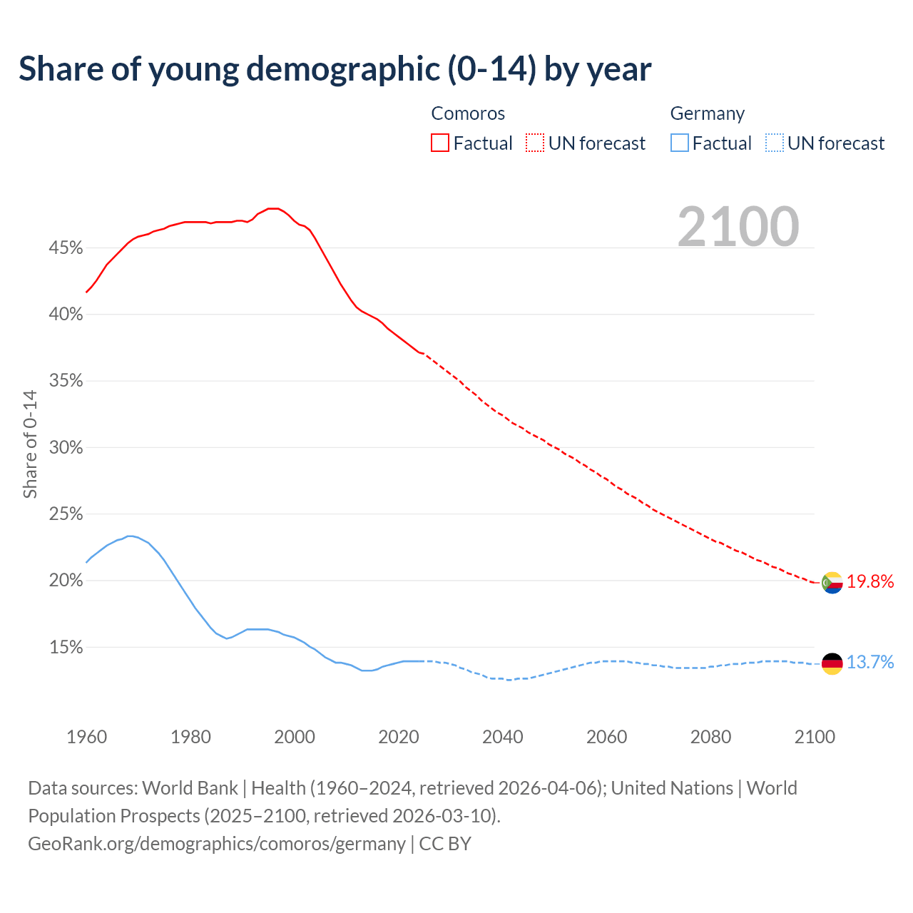 - The share of young demographic (0-15 years old) in Comoros is 37.1% vs 13.9% in Germany.