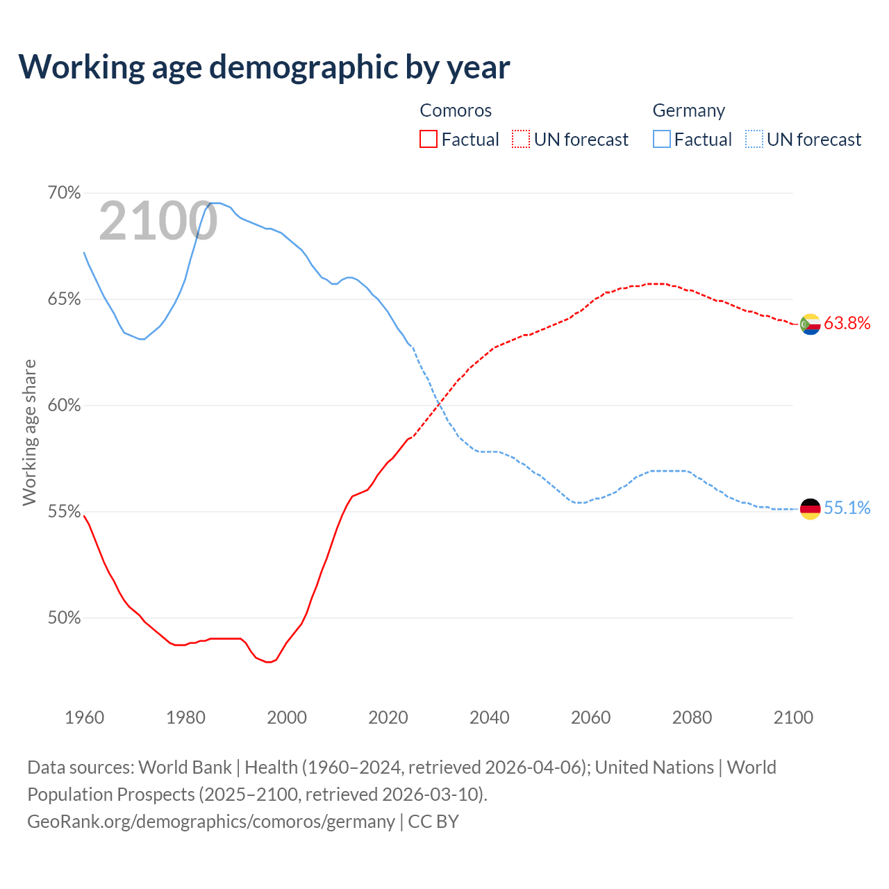- Comoros has 528K working age adults (aged 15-64) vs 51.9M in Germany.