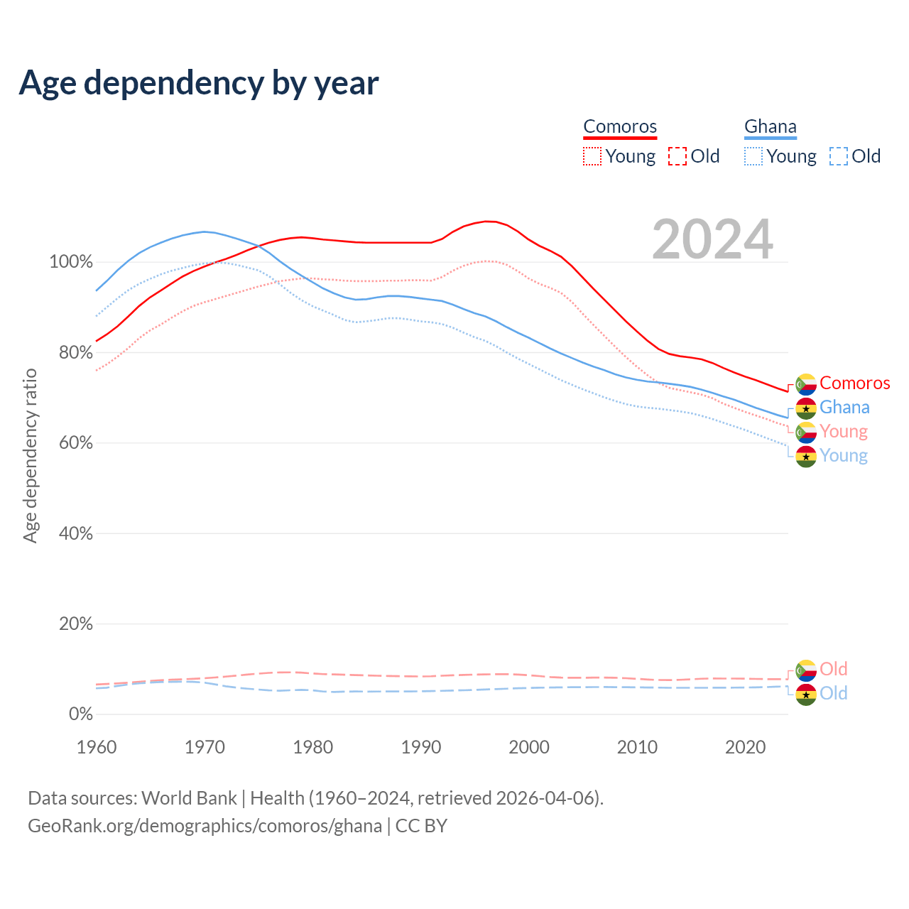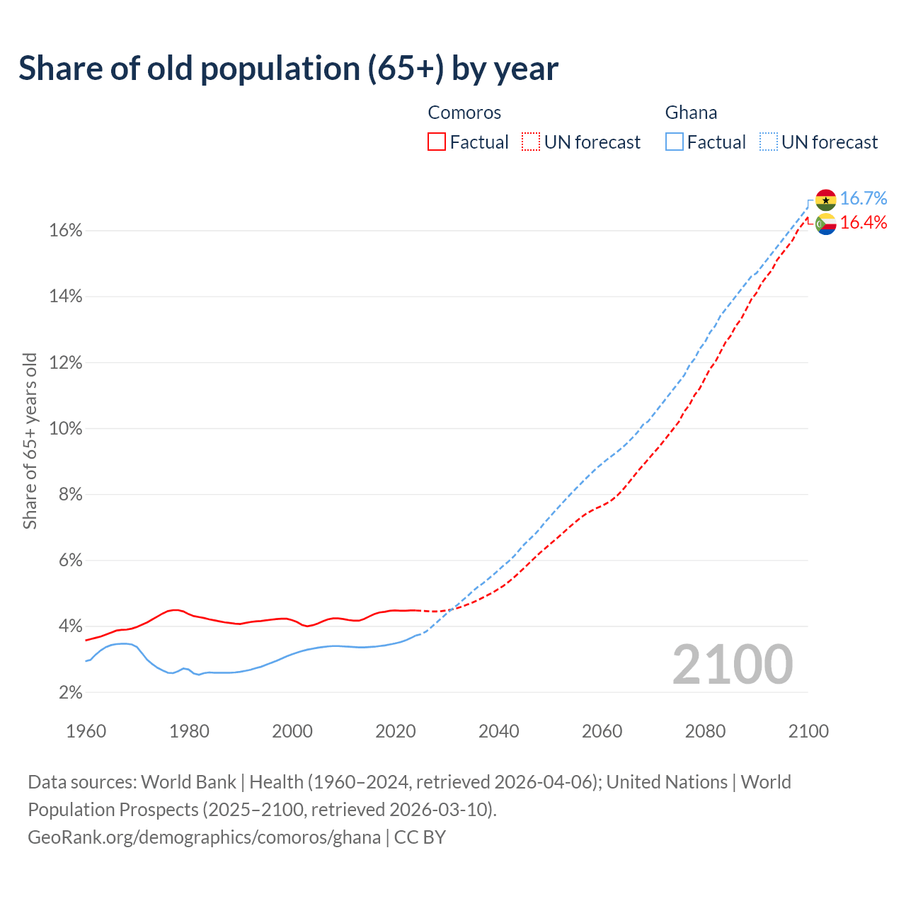 - The share of old-age demographic (65+) in Comoros is 4.47% vs 3.71% in Ghana.