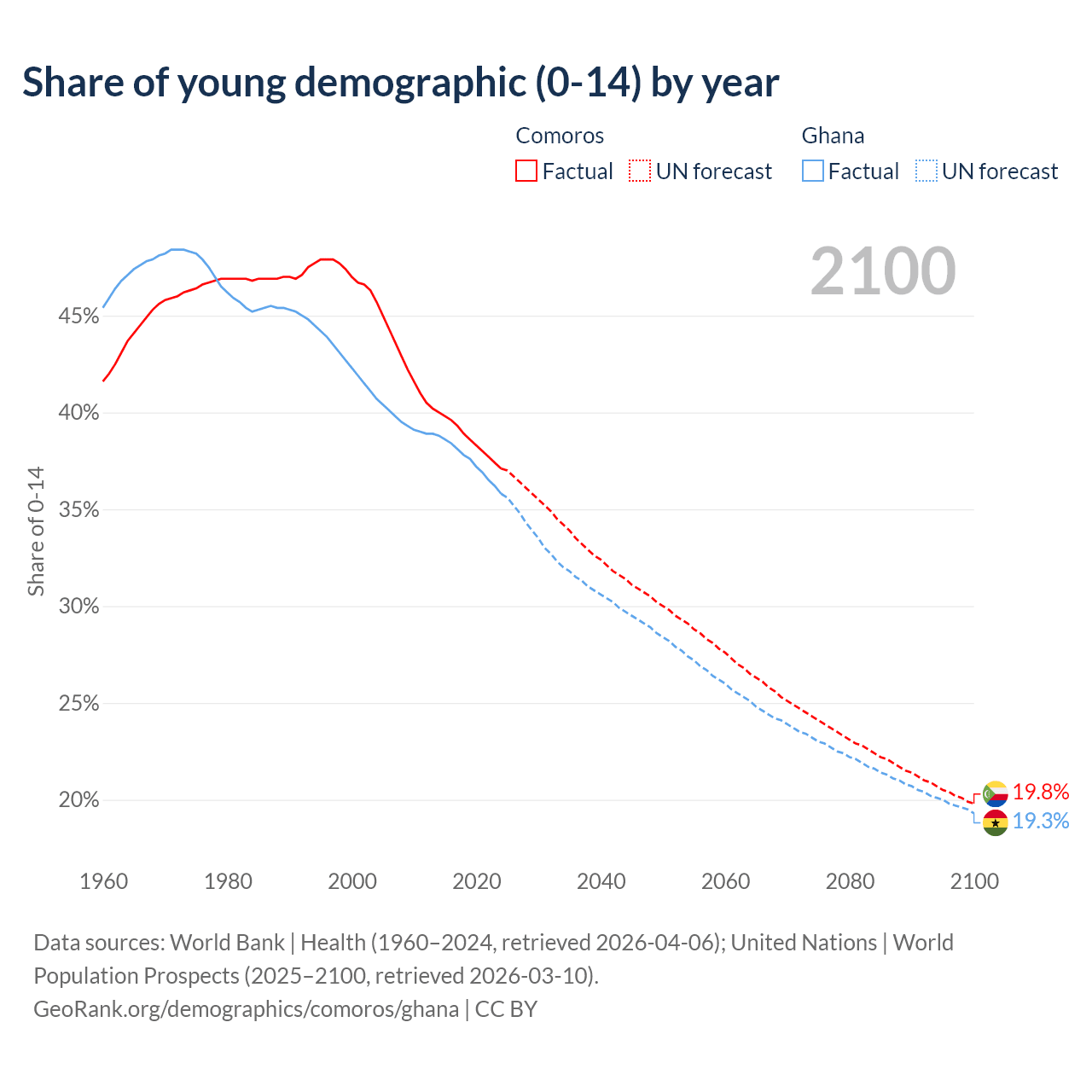 - The share of young demographic (0-15 years old) in Comoros is 37.1% vs 35.8% in Ghana.