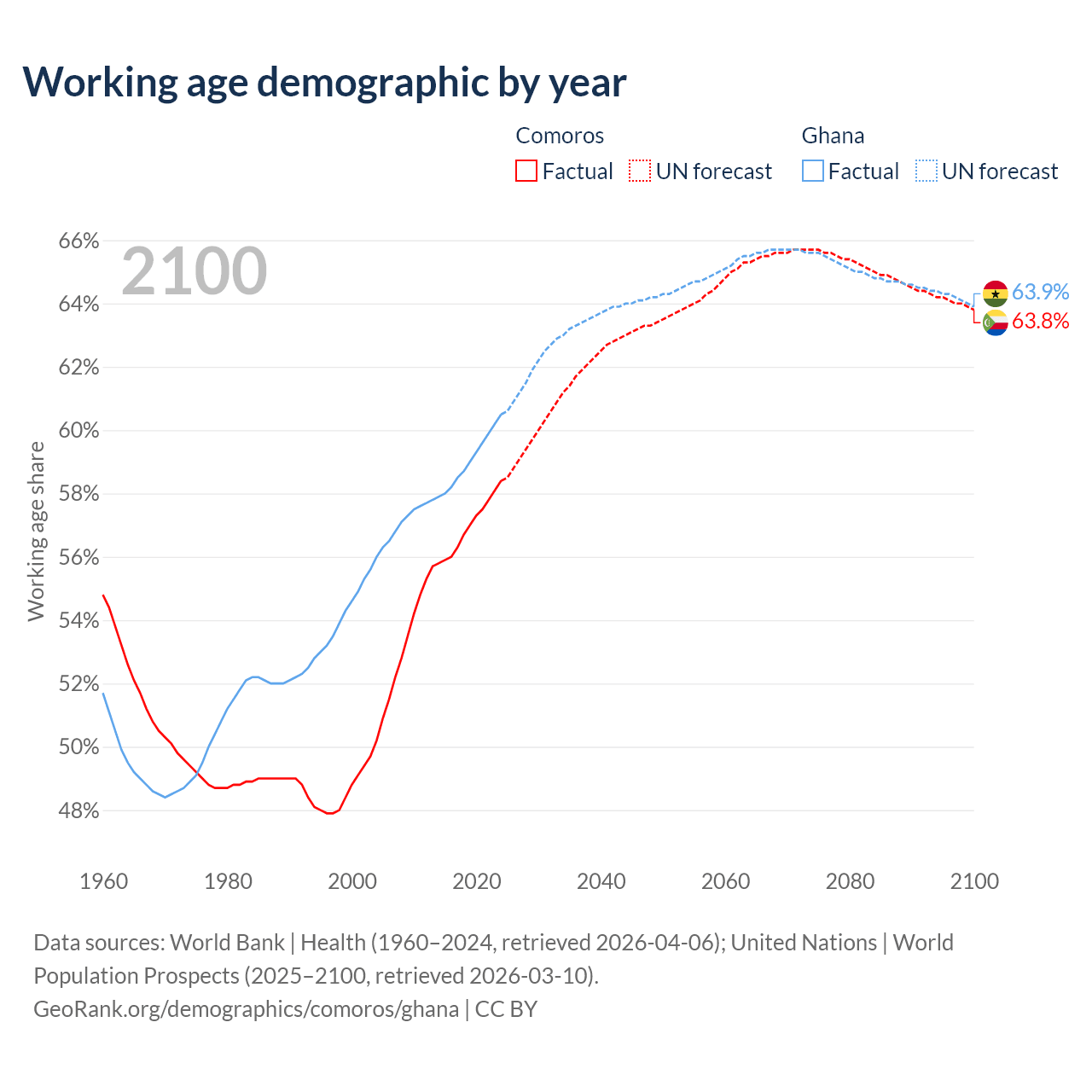 - Comoros has 528K working age adults (aged 15-64) vs 21.7M in Ghana.