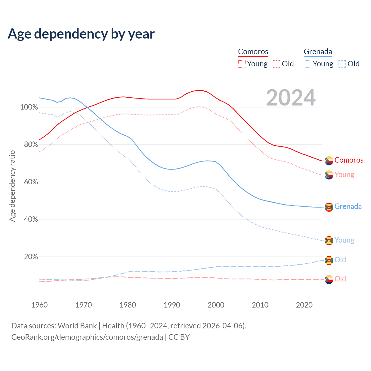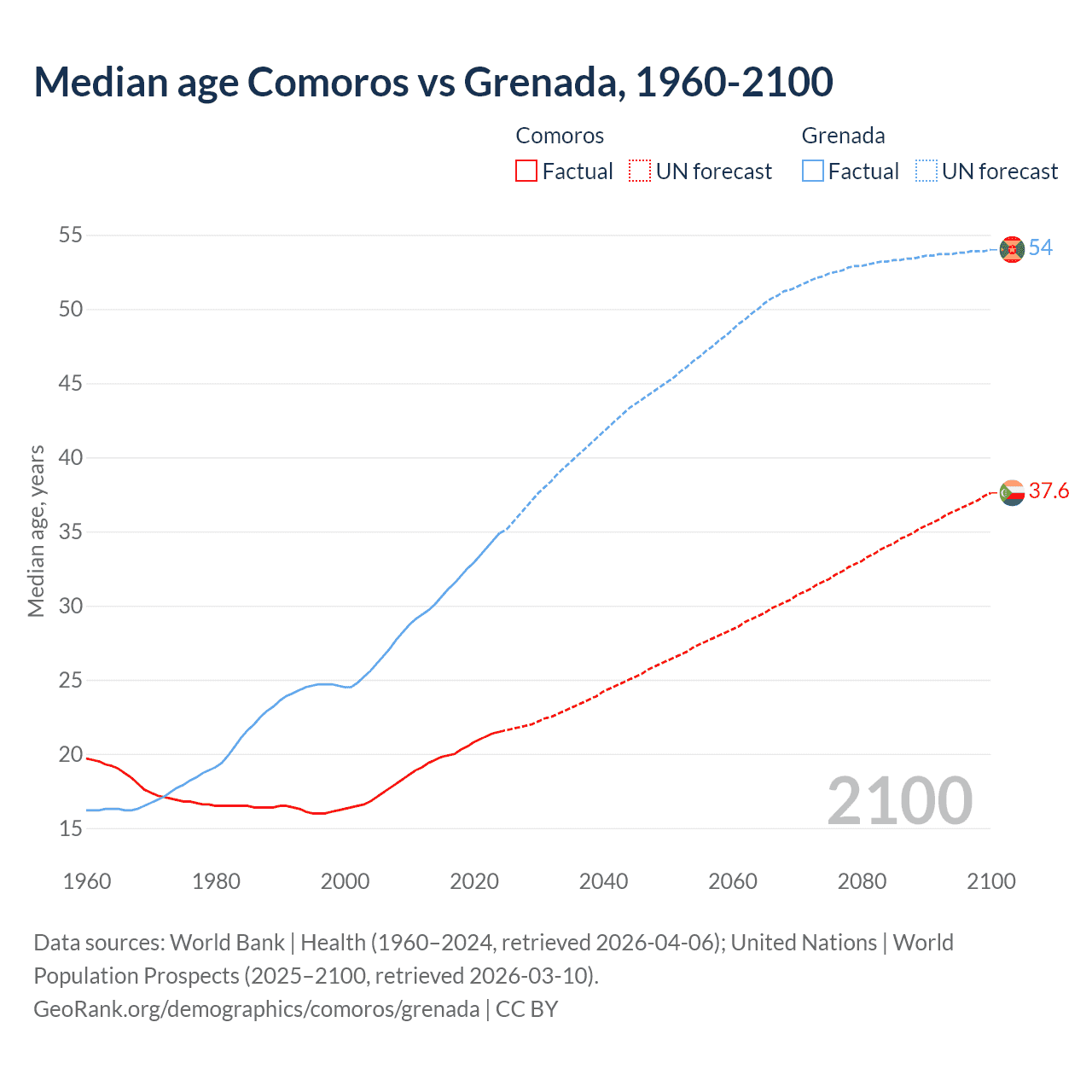 - Comoros is ranked 152/196 by median age (oldest to youngest) vs 77/196 for Grenada.
