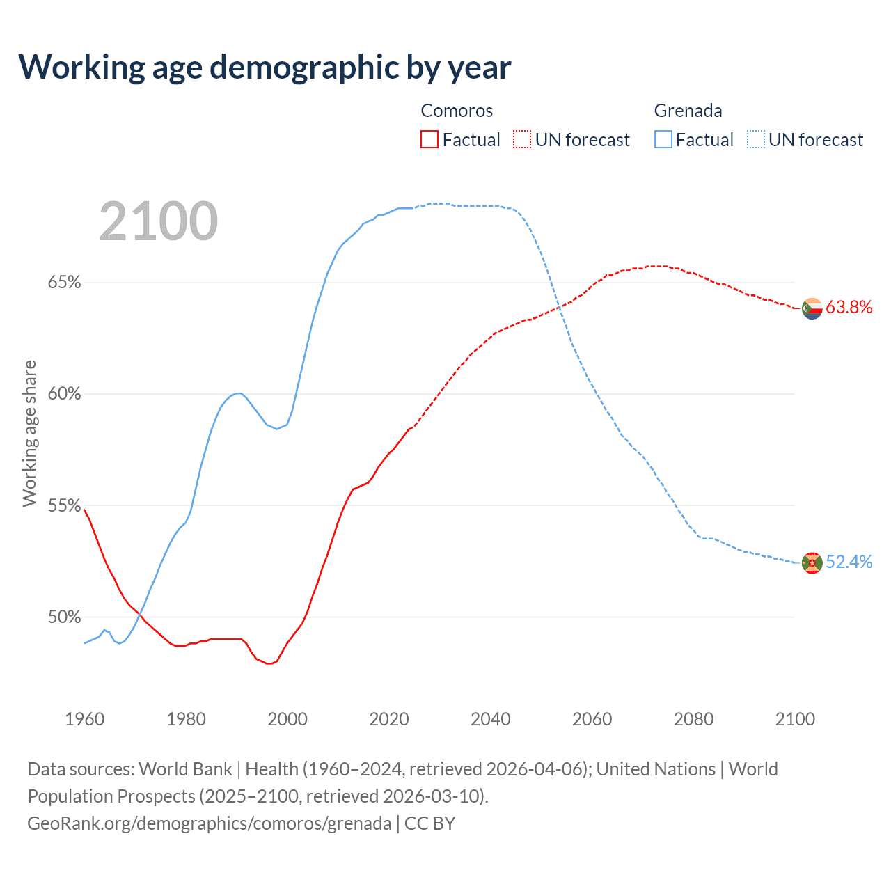 - Comoros has 528K working age adults (aged 15-64) vs 80.2K in Grenada.