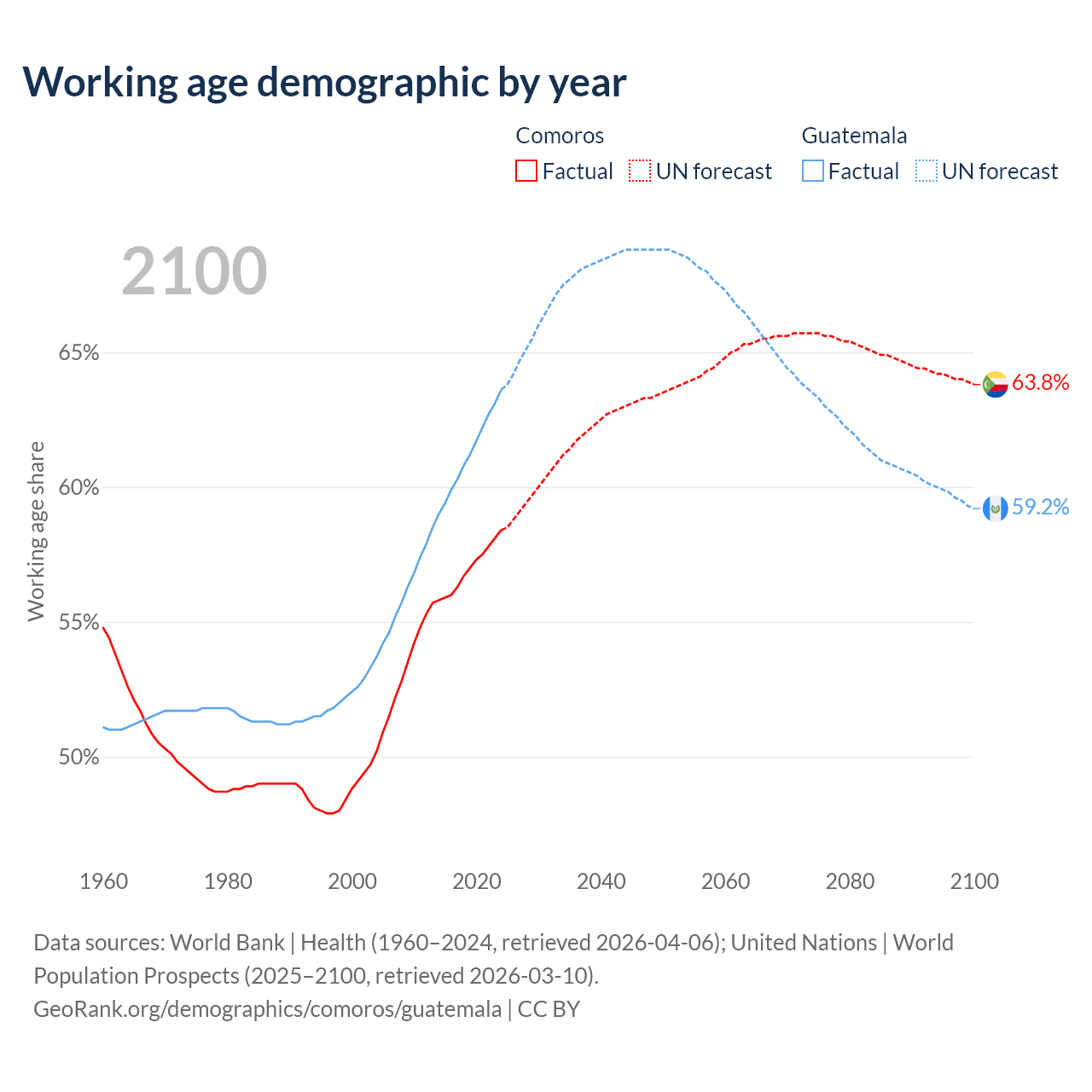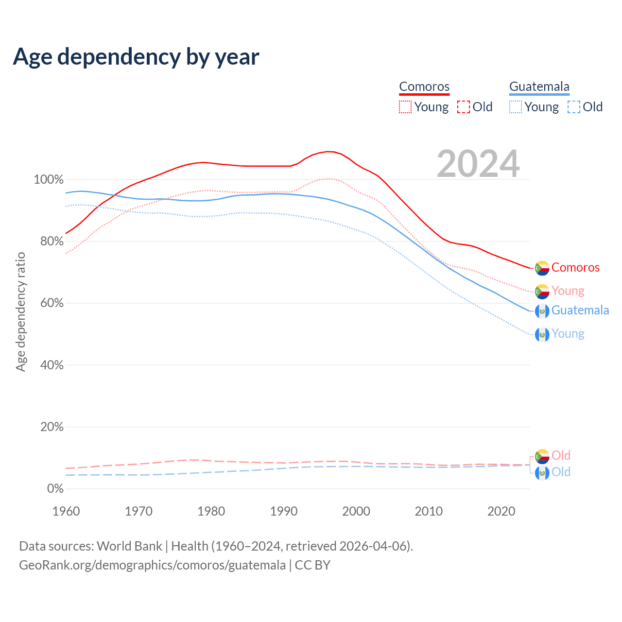 - The share of old-age demographic (65+) in Comoros is 4.47% vs 4.85% in Guatemala.