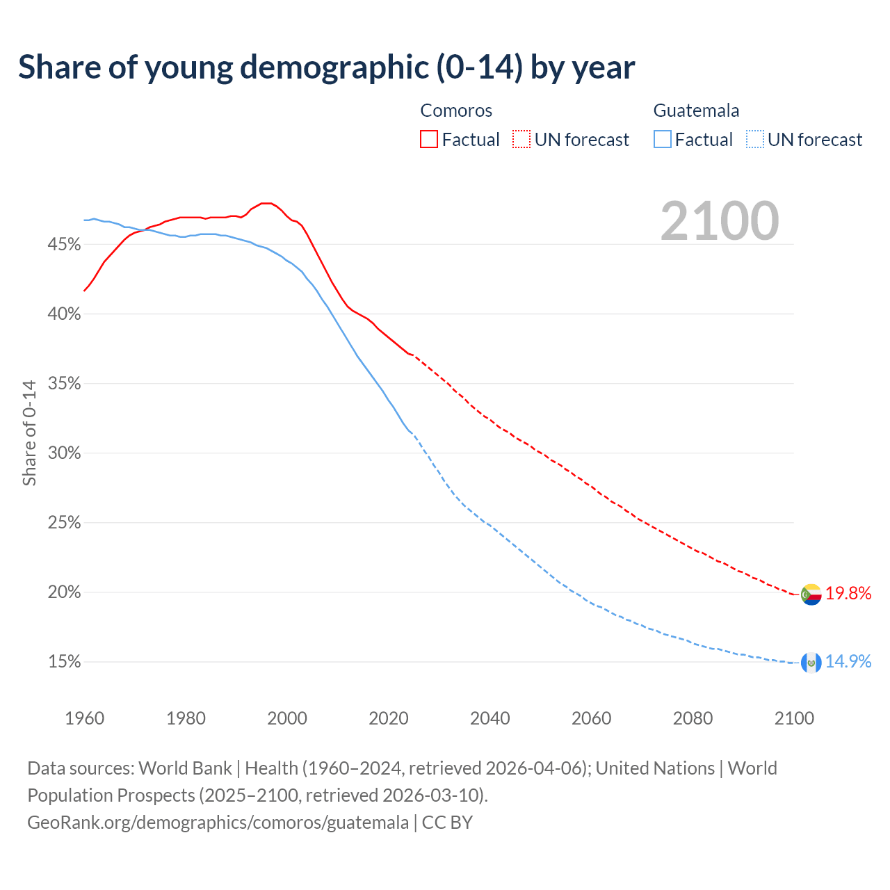 - The share of young demographic (0-15 years old) in Comoros is 37.1% vs 31.6% in Guatemala.