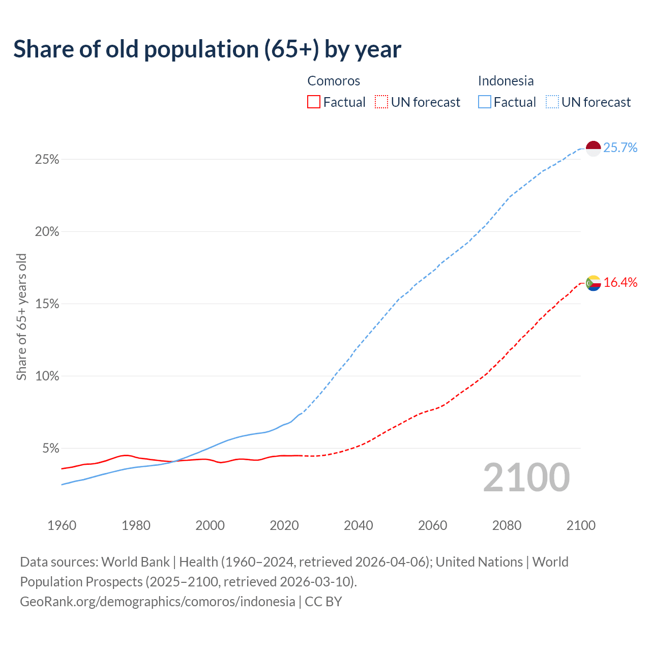 - The share of old-age demographic (65+) in Comoros is 4.47% vs 7.29% in Indonesia.