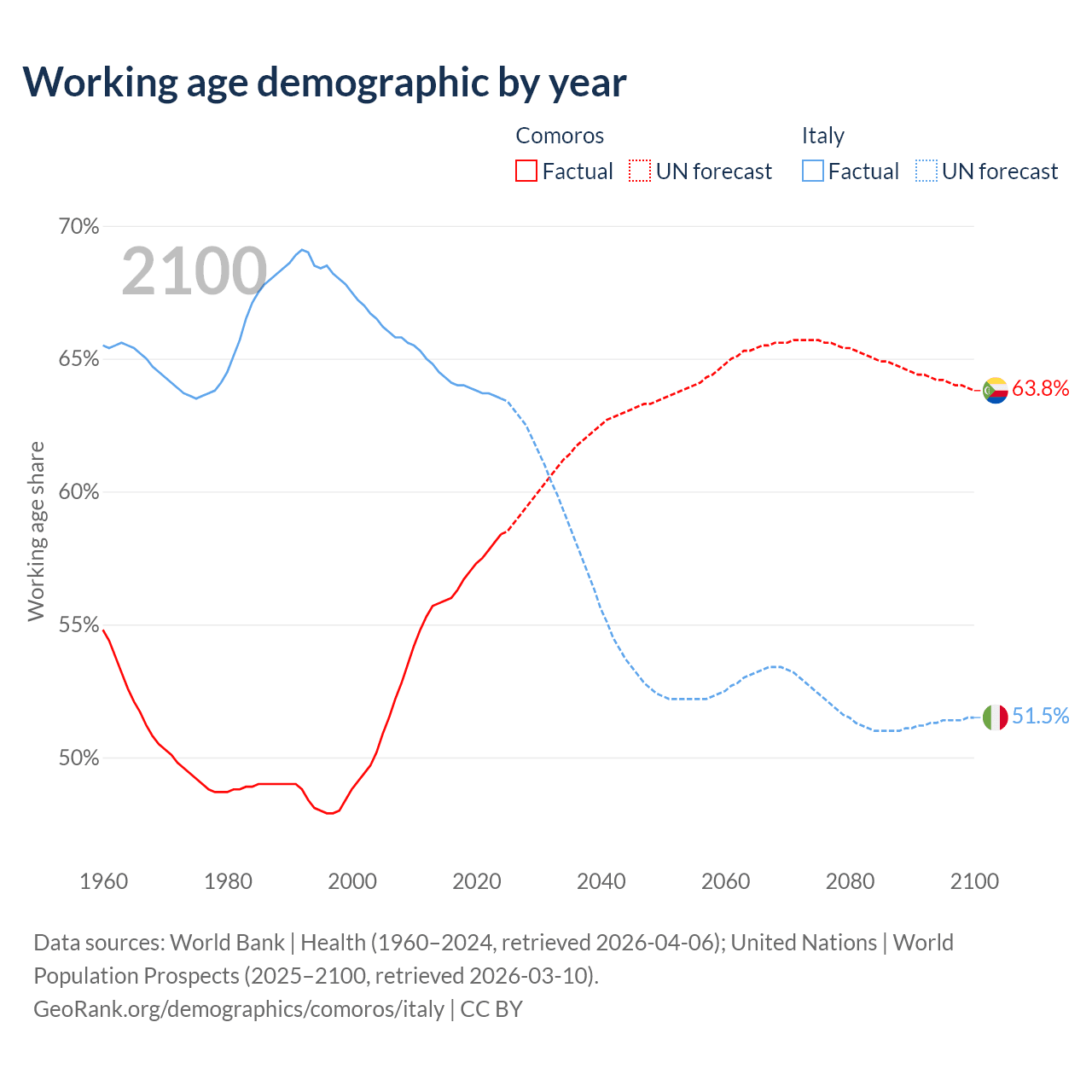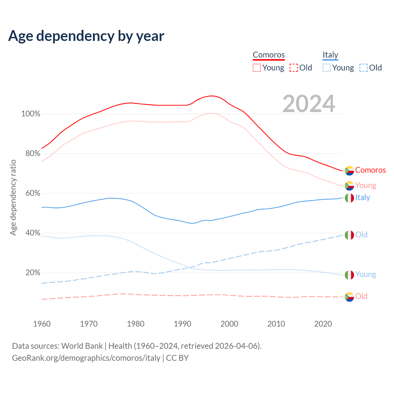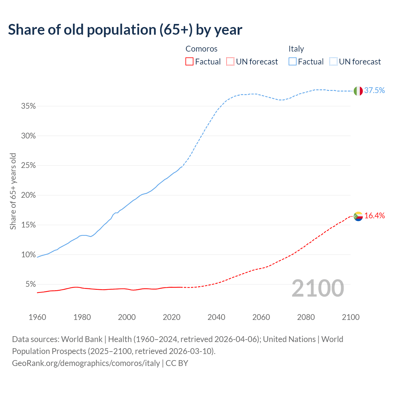 - The share of old-age demographic (65+) in Comoros is 4.47% vs 24.6% in Italy.