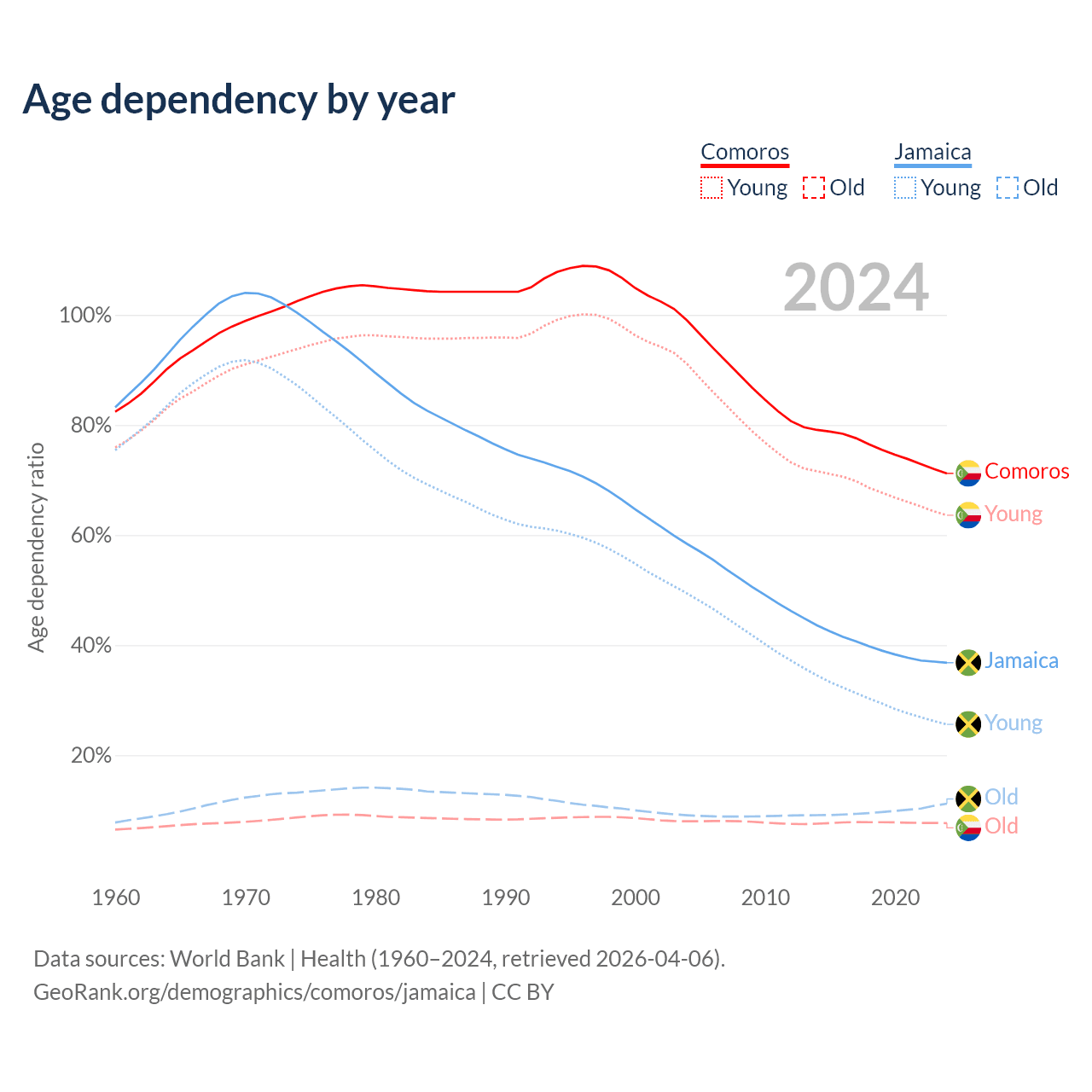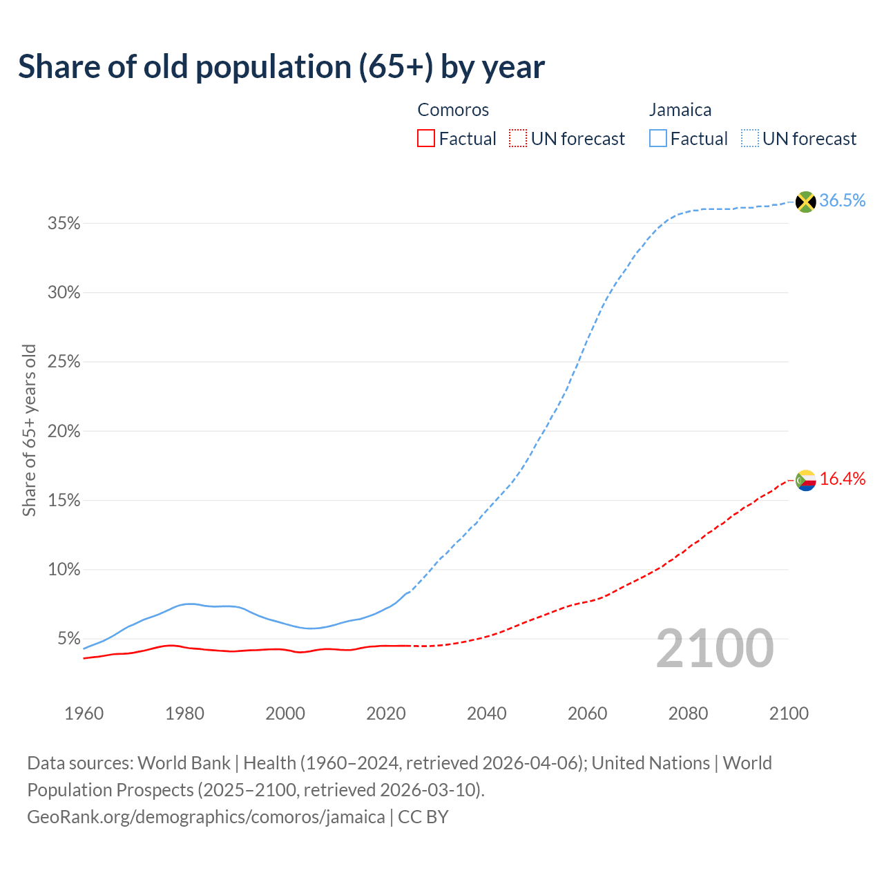 - The share of old-age demographic (65+) in Comoros is 4.47% vs 8.21% in Jamaica.