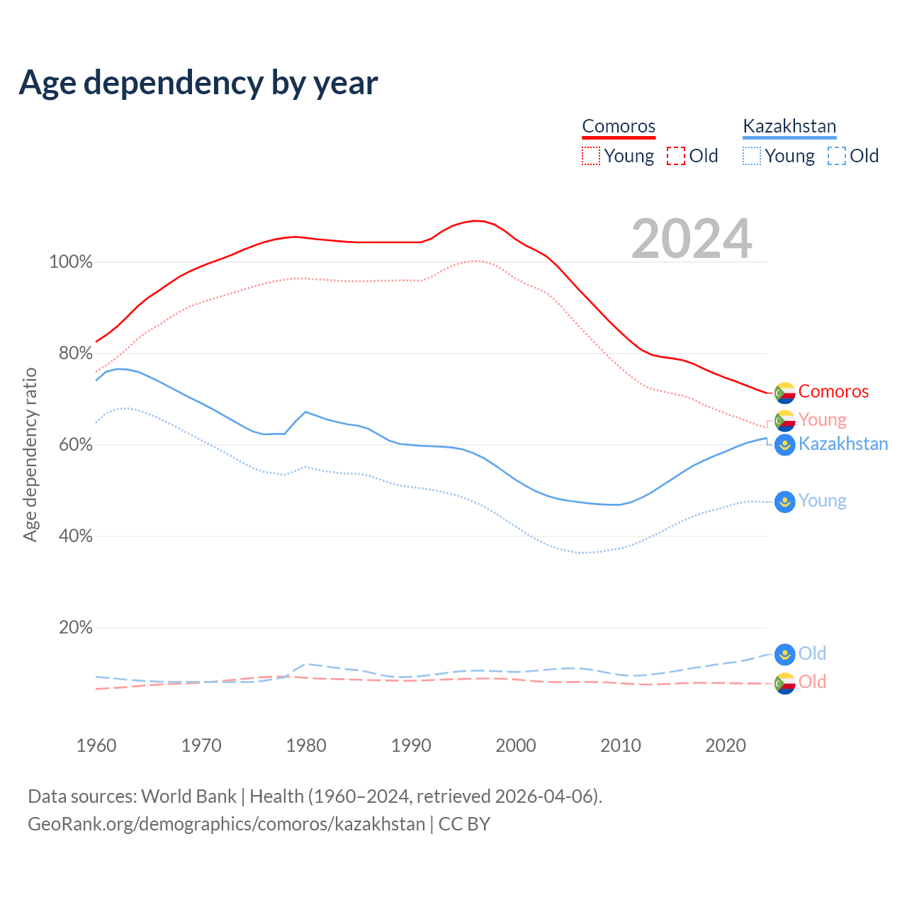- Comoros is ranked 152/196 by median age (oldest to youngest) vs 99/196 for Kazakhstan.