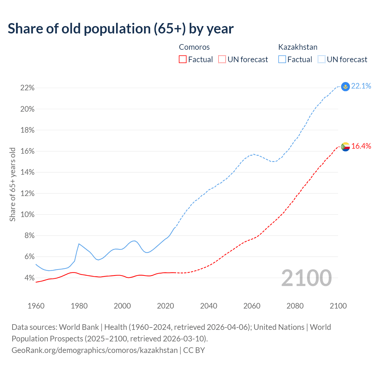 - The share of old-age demographic (65+) in Comoros is 4.47% vs 8.65% in Kazakhstan.